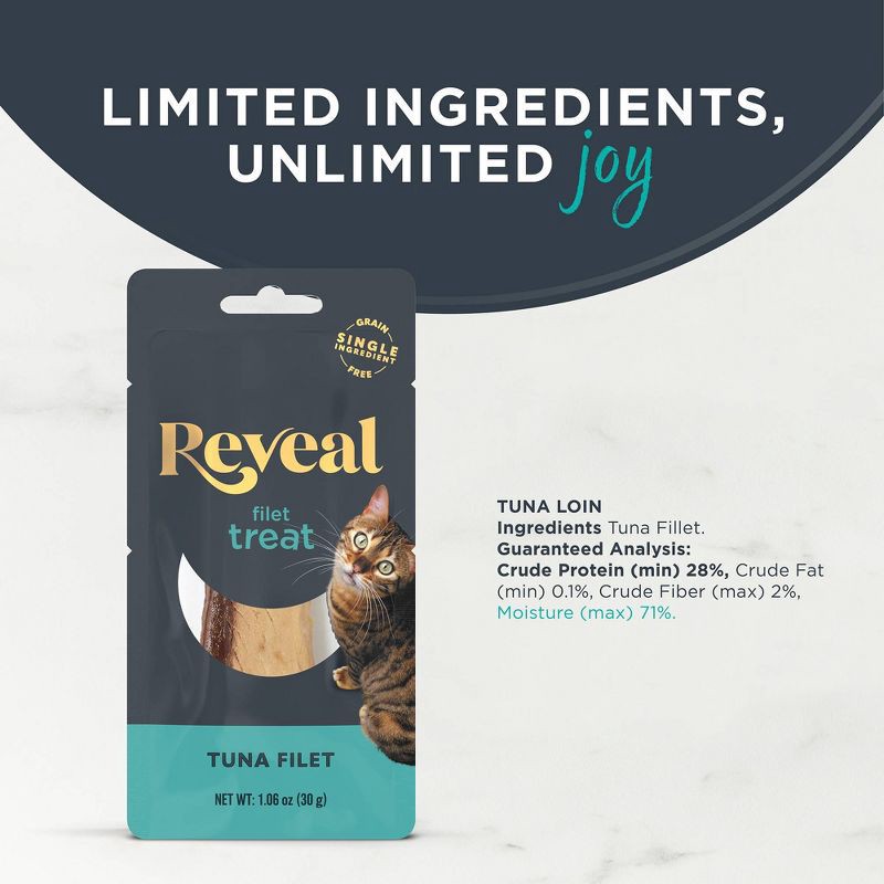 - Single Ingredient Cat Treats: Show your cat some love with a tasty Reveal treat. Our Whole Protein Loins are exactly that – 100% tuna, 100% natural, and nothing else. These treats are a natural complementary treat or topper for adult cats.