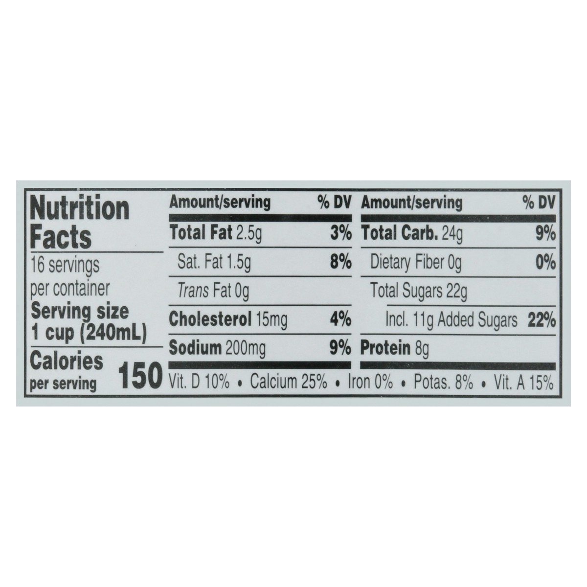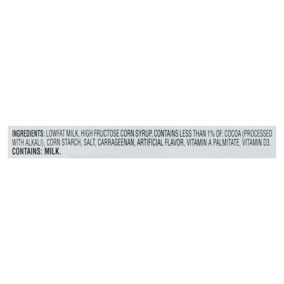 Lowfat Milk, High Fructose Corn Syrup, Contains Less than 1% of: Cocoa (Processed with Alkali), Corn Starch, Salt, Carrageenan, Artificial Flavor, Vitamin A Palmitate, Vitamin D3.