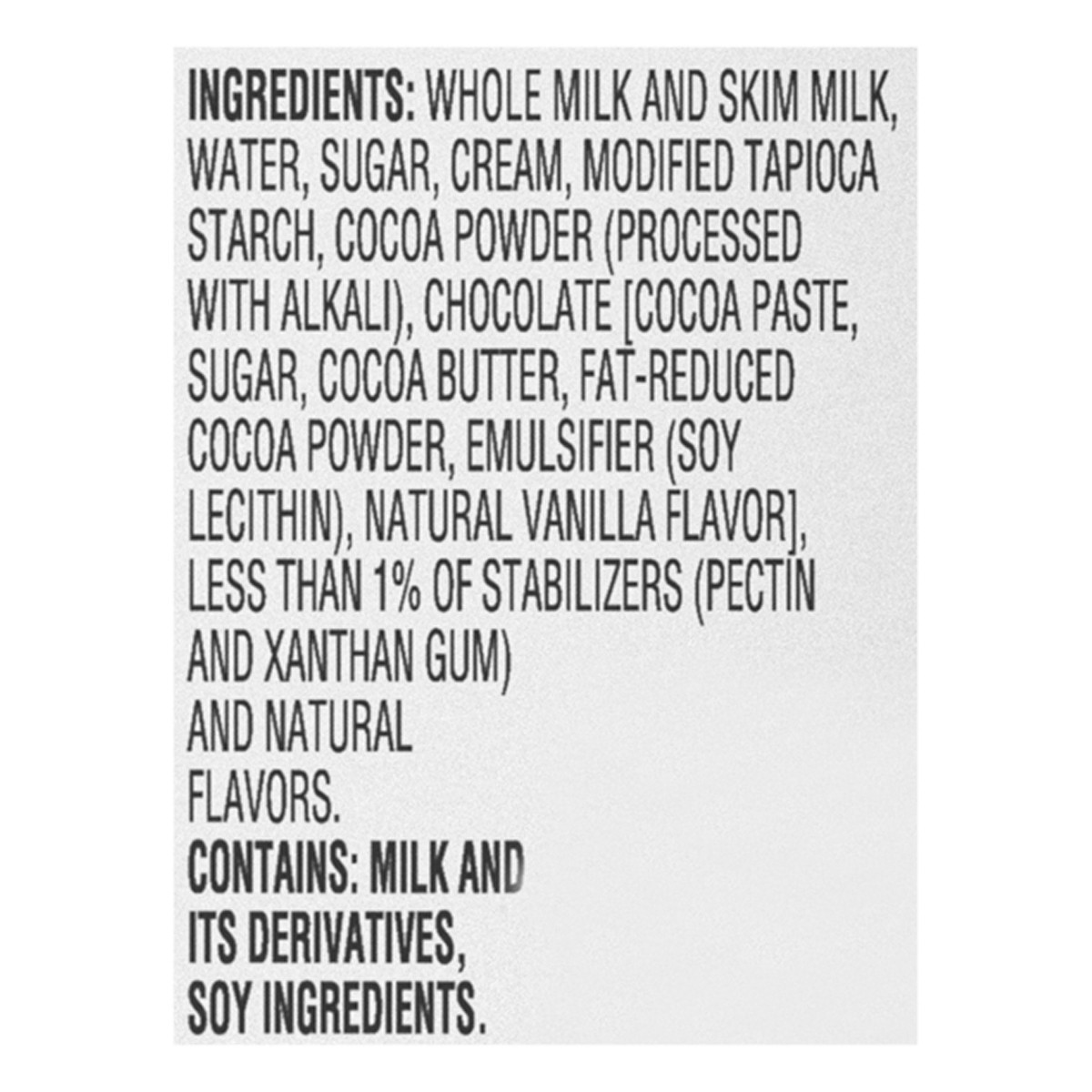Whole Milk and Skim Milk, Water, Sugar, Cream, Modified Tapioca Starch, Cocoa Powder (Processed with Alkali), Chocolate [Cocoa Paste, Sugar, Cocoa Butter, Fat-Reduced Cocoa Powder, Emulsifier (Soy Lec…