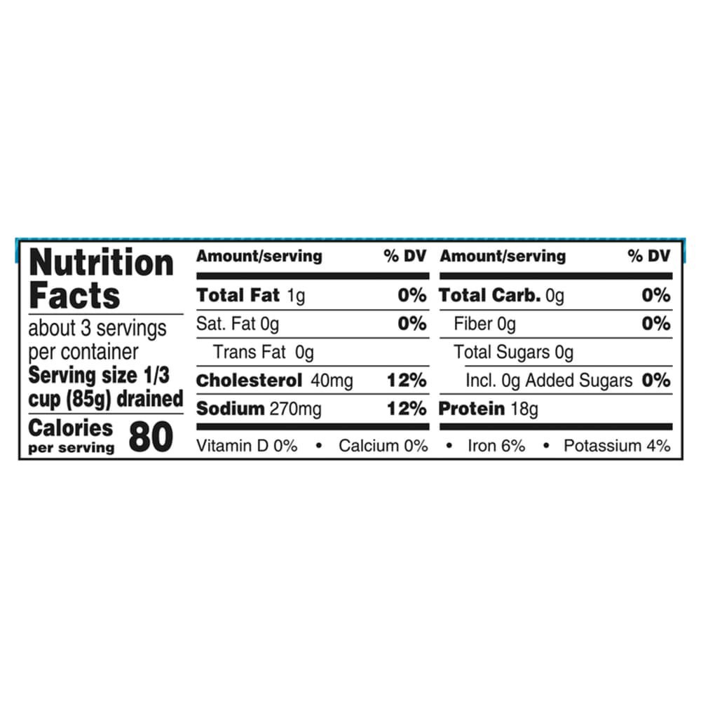 Ingredients: Tuna, Water, Vegetable Broth (Peas, Carrots), Salt.