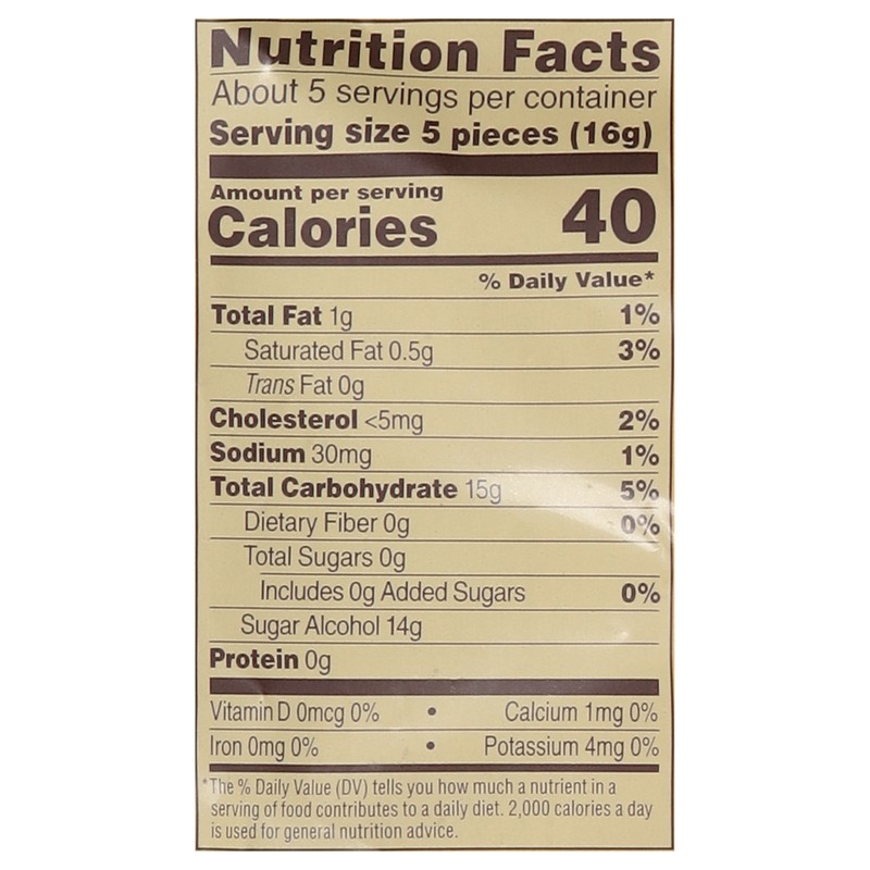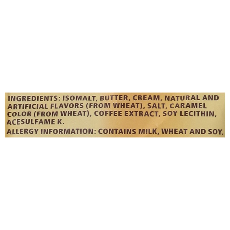 Isomalt, Butter, Cream, Natural and Artificial Flavors, Salt, Caramel Color, Coffee Extract, Soy Lecithin Emulsifier, Acesulfame K.