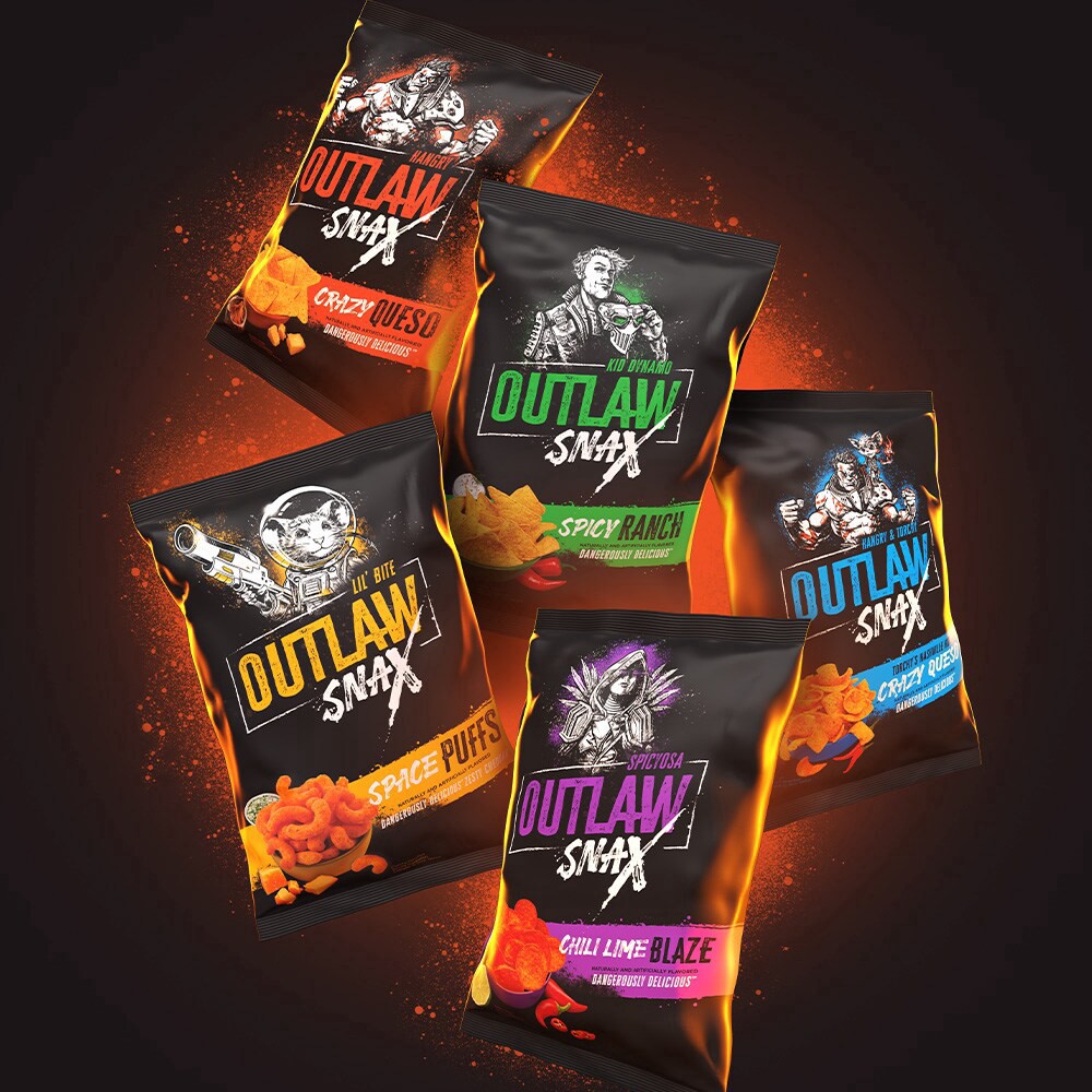 Dangerously delicious™ Outlaw Snax pack a fistful of flavor in every bite. Bold packaging will stand out at shelf, daring customers to try. Saddle up with the wildest bunch of chips this side of the s…