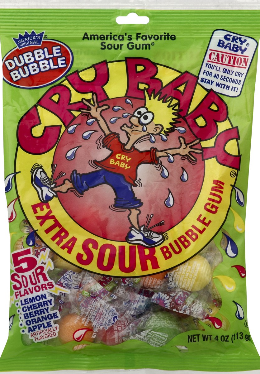 5 Sour Flavors: lemon; cherry; berry; orange; apple. Artificially flavored. America''s original Dubble Bubble. America''s favorite sour gum. Cry Baby, Caution. You''ll only cry for 40 seconds, stay wi…