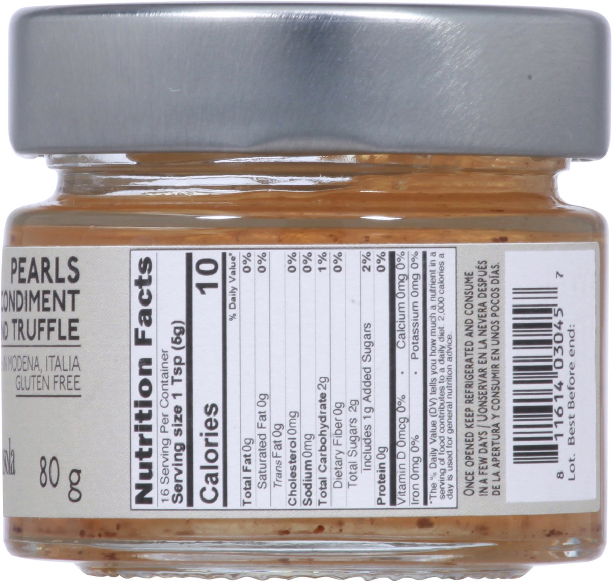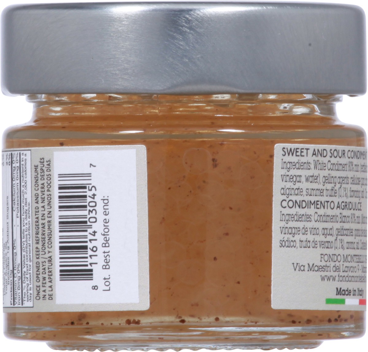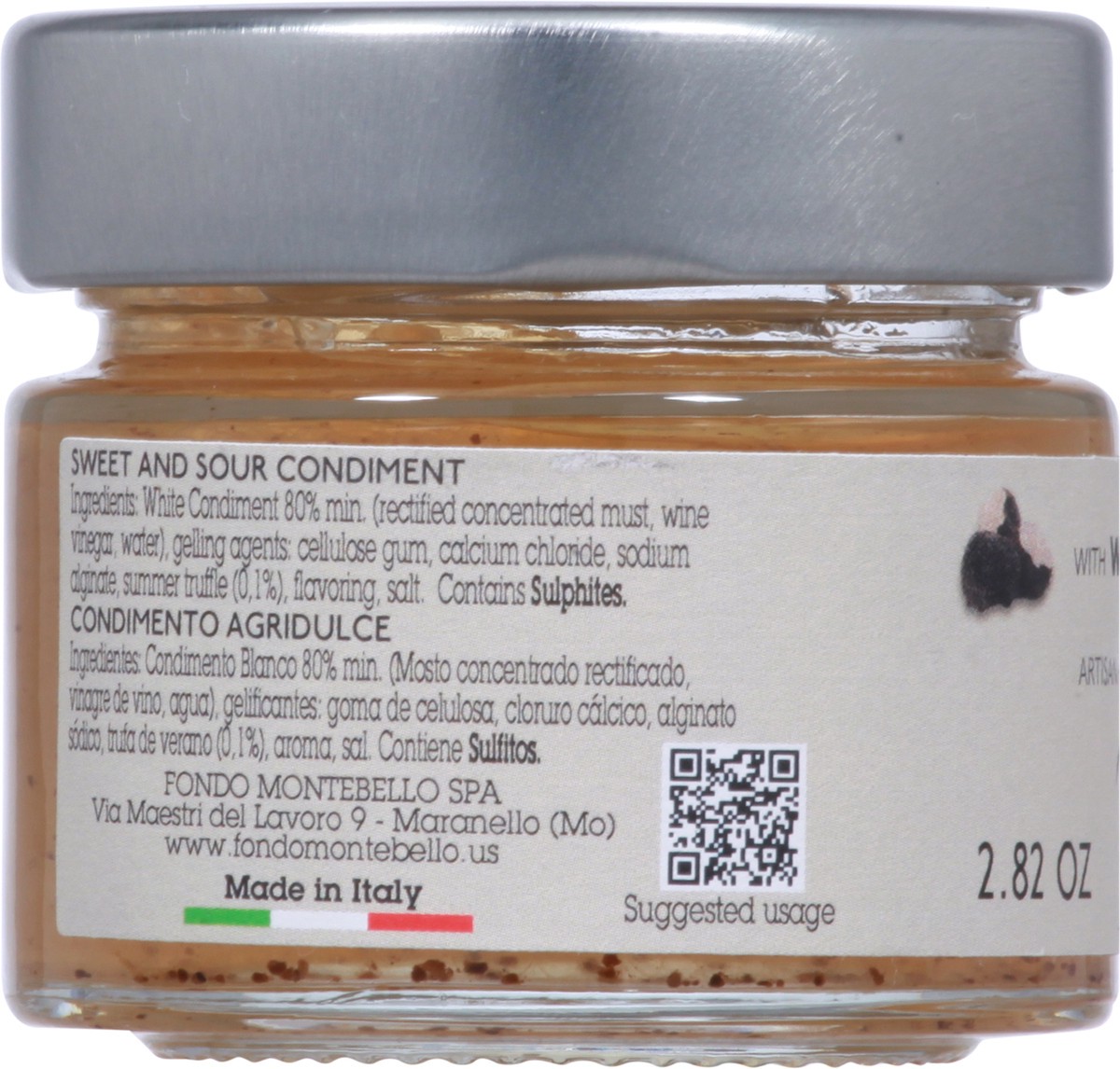 White Condiment 80% Min, (Rectified Concentrated Must, Wine Vinegar, Water), Gelling Agents: Cellulose Gum, Calcium Chloride, Sodium Alginate, Summer Truffle (0.1%), Flavoring, Salt.