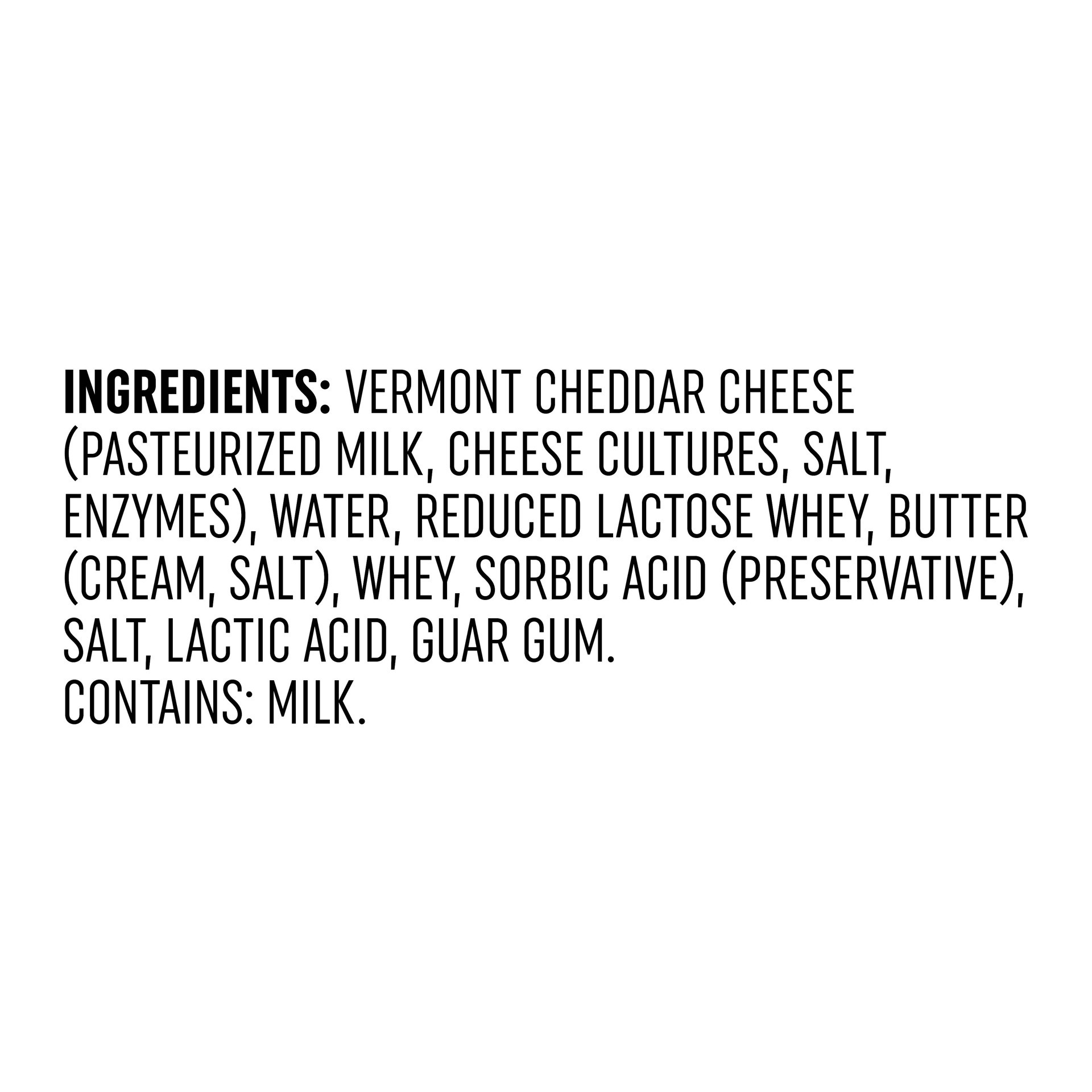 Vermont Cheddar Cheese (Pasteurized Milk, Cheese Cultures, Salt, Enzymes), Water, Reduced Lactose Whey, Cream, Whey, Sorbic Acid (a preservative), Salt, Lactic Acid, Guar Gum
