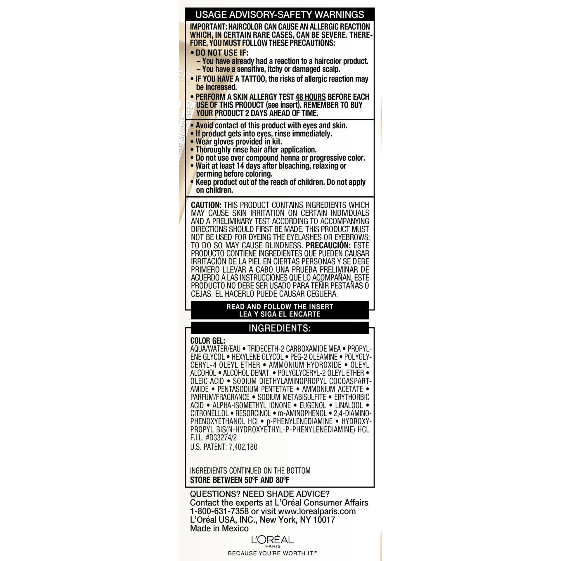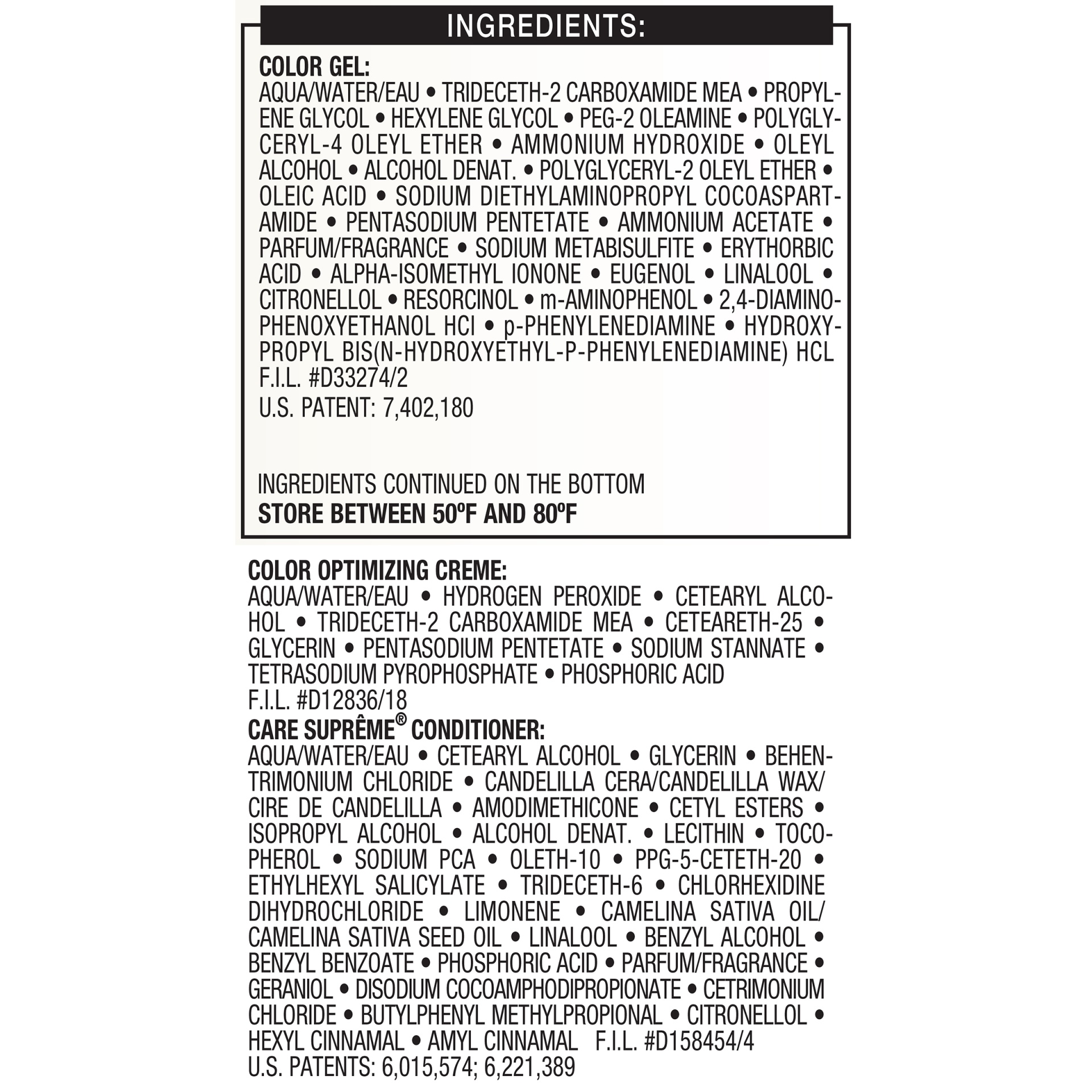 Color Gel: Aqua/Water, Trideceth-2 Carboxamide MEA, Propylene Glycol, Hexylene Glycol, PEG-2 Oleamine, Polyglyceryl-4 Oleyl Ether, Ammonium Hydroxide, Oleyl Alcohol, Alcohol Denat., Polyglyceryl-2 Ole…