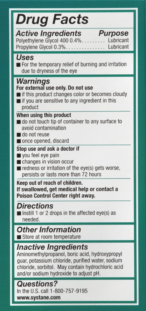 Active Ingredients: Polyethylene Glycol 400 (0.4%), Propylene Glycol (0.3%). Purpose: Lubricant, Lubricant. Inactive Ingredients: Aminomethylproponal, Boric Acid, Hydroxypropyl Guar, Potassium Chlorid…