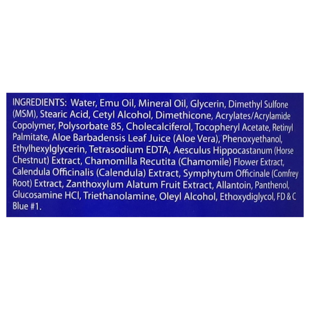 Water, Emu Oil, Mineral Oil, Glycerin, Dimethyl Sulfone (MSM), Stearic Acid, Cetyl Alcohol, Dimethicone, Acrylates/Acrylamide Copolymer, Polysorbate 85, Cholecalciferol, Tocopheryl Acetate, Retinyl Pa…