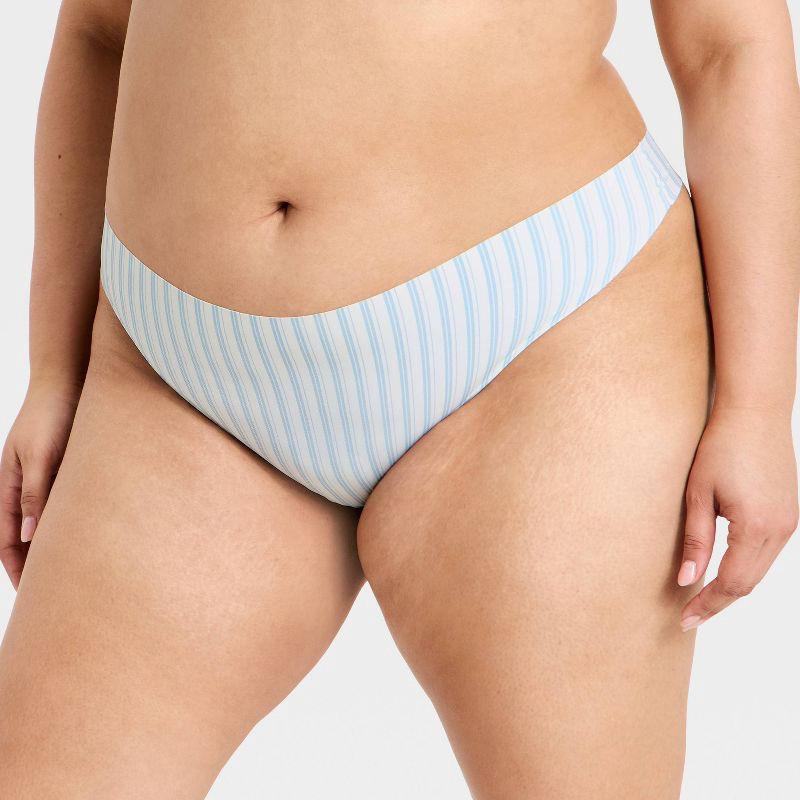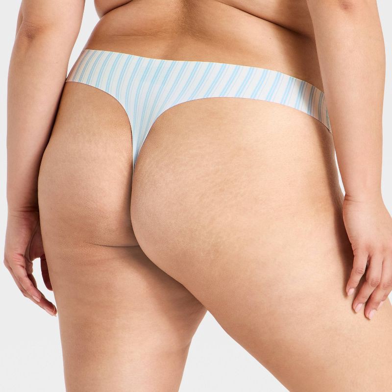 Three-pack underwear set from Wild Fable™ includes pairs of micro thong underwear with invisible edges — one in olive green, one in fruit-printed pink, and one in white with blue stripes. Each low-ris…