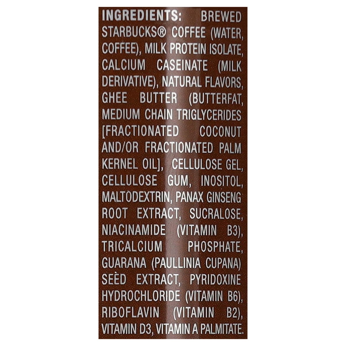 Brewed Starbucks Coffee (Water, Coffee), Milk Protein Isolate, Calcium Caseinate (Milk Derivative), Natural Flavors, Ghee Butter (Butterfat, Medium Chain Triglycerides [Fractionated Coconut and/or Fra…