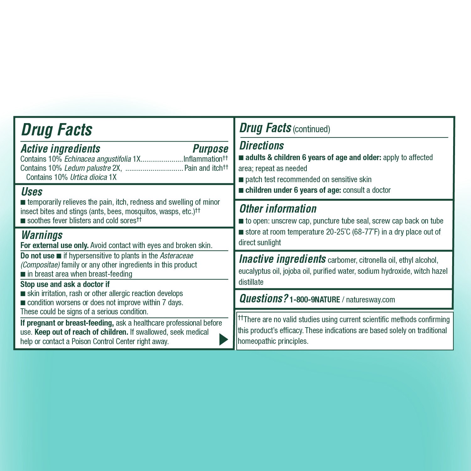 Active ingredients & purpose; Contains 10% Echinacea angustifolia 1X (Inflammation††); Contains 10% ea. Ledum palustre 2X and Urtica Dioica 1X (Pain and itch††); Carbomer; Citronella Oil; Ethyl Al…