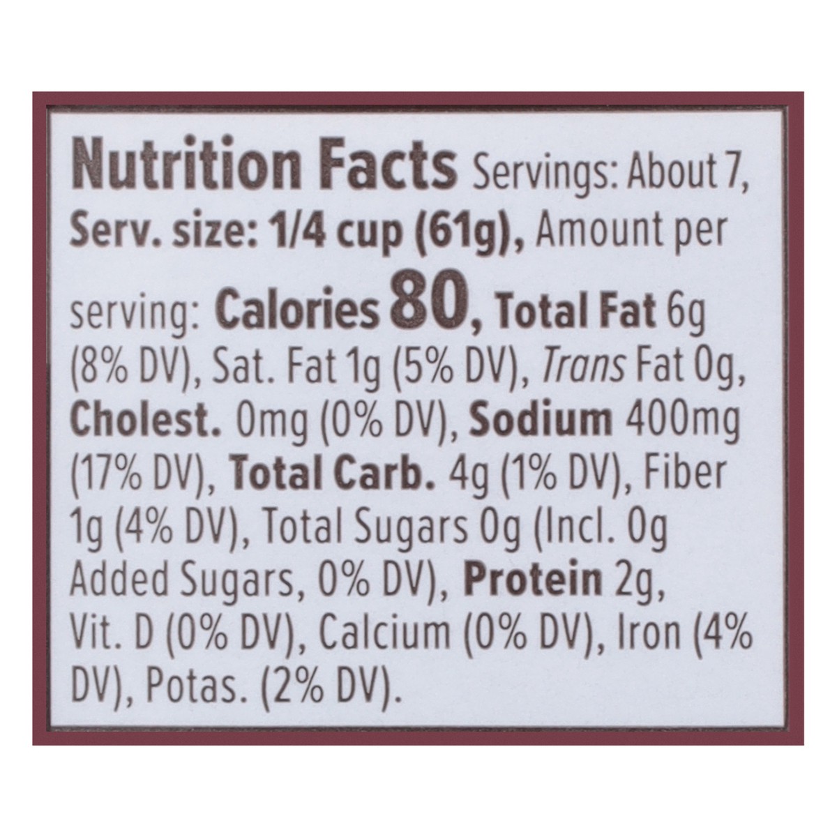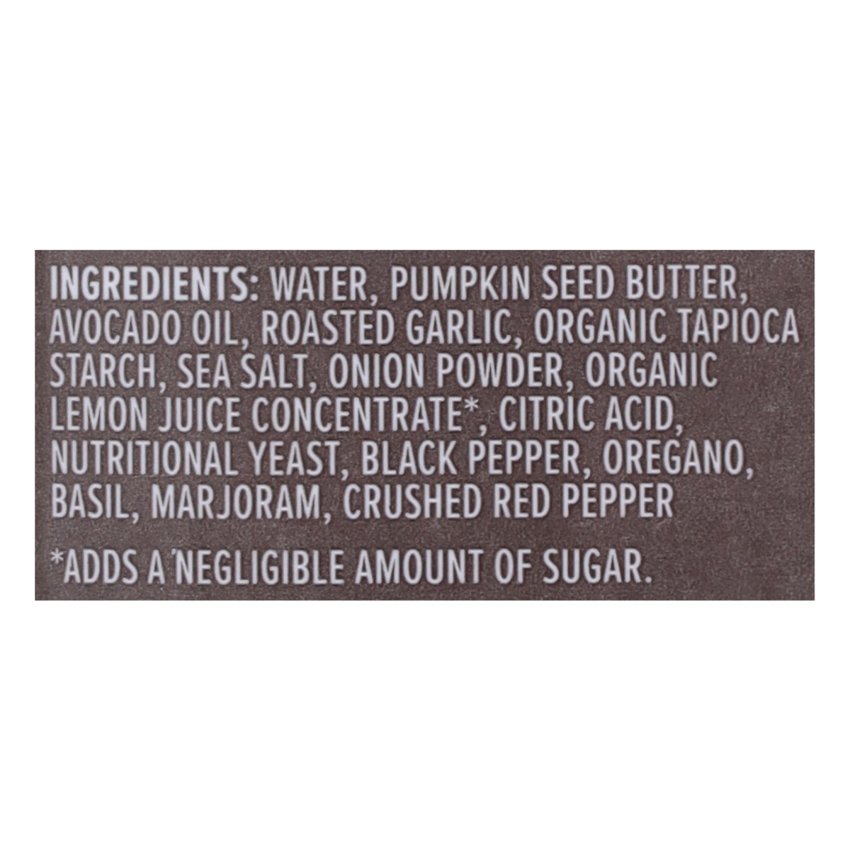 Water, Pumpkin Seed Butter, Avocado Oil, Roasted Garlic, Organic Tapioca Starch, Sea Salt, Onion Powder, Organic Lemon Juice Concentrate (Adds a Negligible Amount of Sugar), Citric Acid, Nutritional Y…