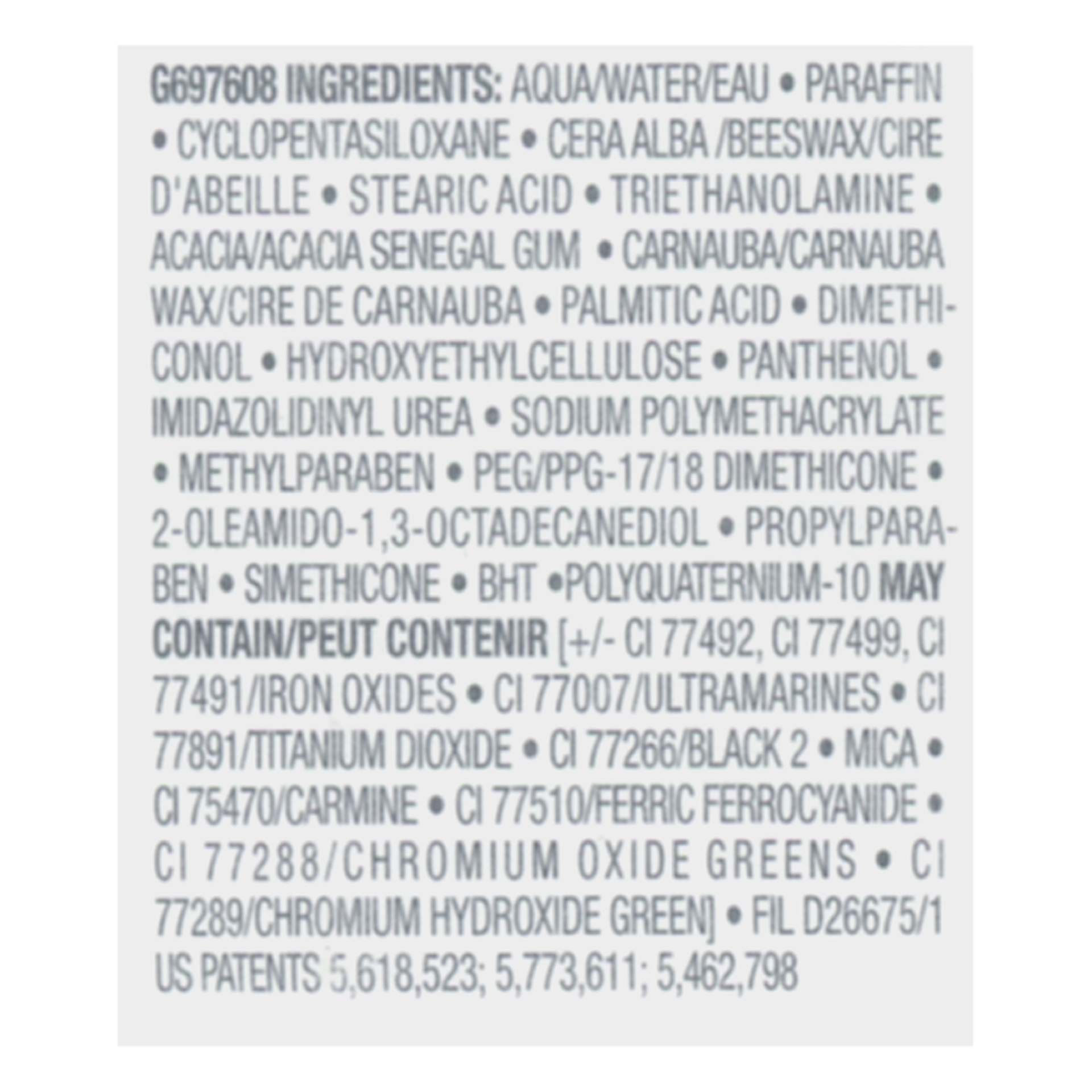 Aqua/Water, Paraffin, Cyclopentasiloxane, Cera Alba /Beeswax, Stearic Acid, Triethanolamine, Acacia/Acacia Senegal Gum, Carnauba/Carnauba Wax, Palmitic Acid, Dimethiconol, Hydroxyethylcellulose, Panth…