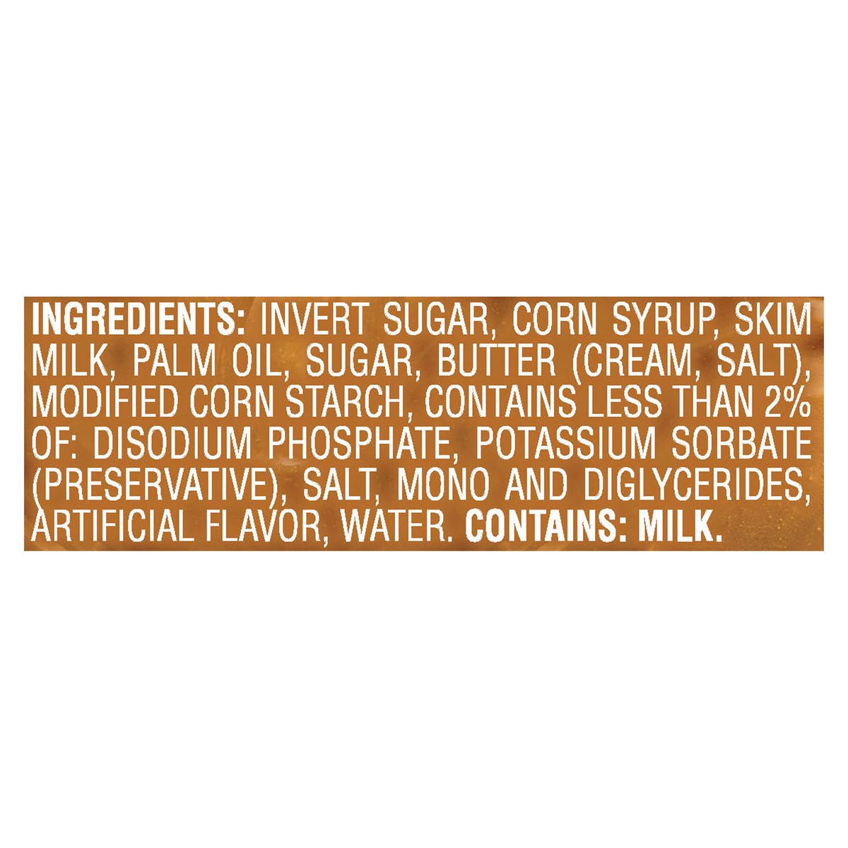 Invert Sugar, Corn Syrup, Skim Milk, Palm Oil Sugar, Butter (Cream, Salt), Modified Corn Starch, Contains Less than 2% of: Disodium Phosphate, Potassium Sorbate (Preservative), Salt, Mono and Diglycer…