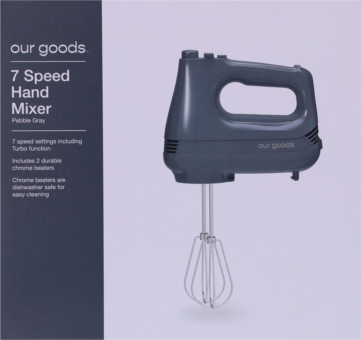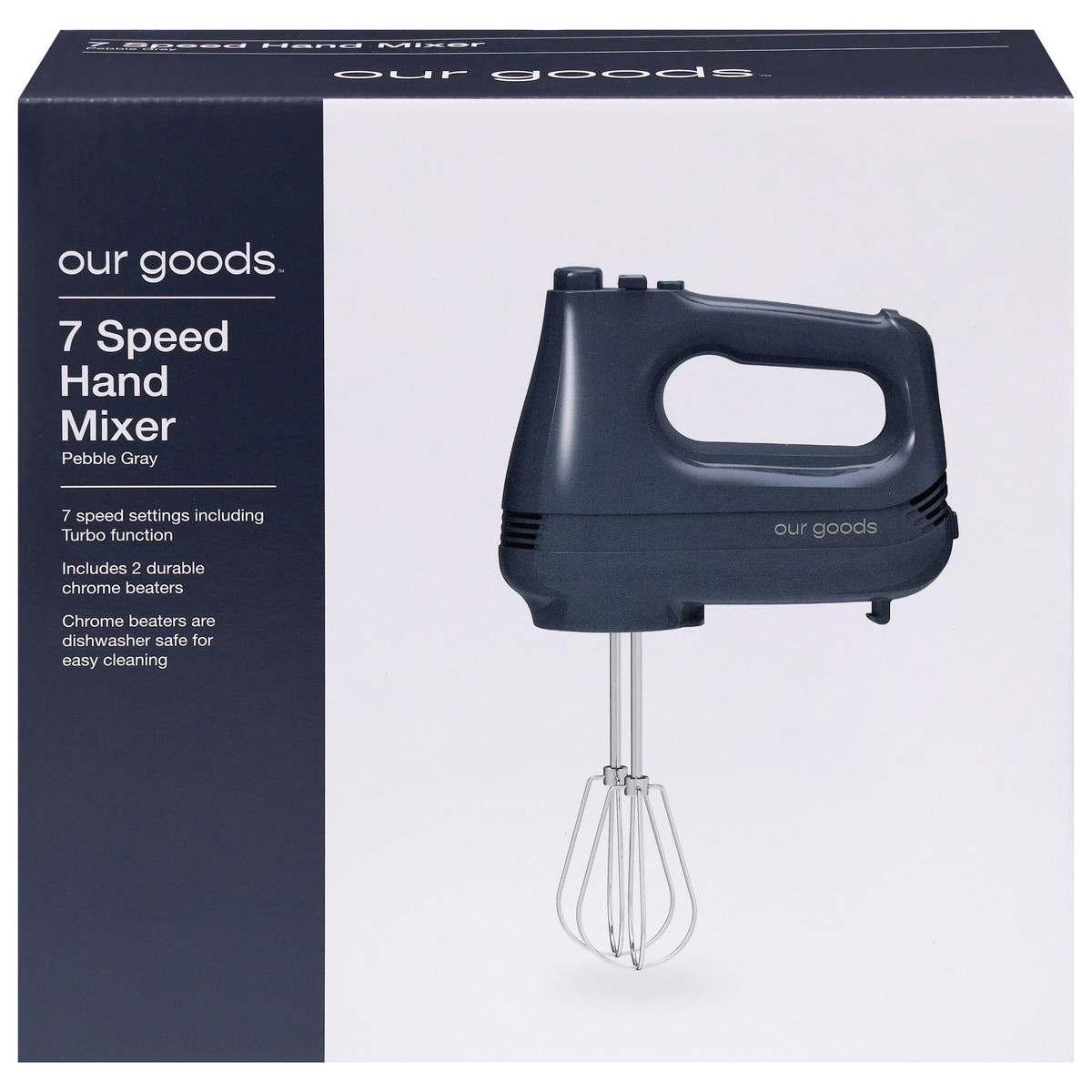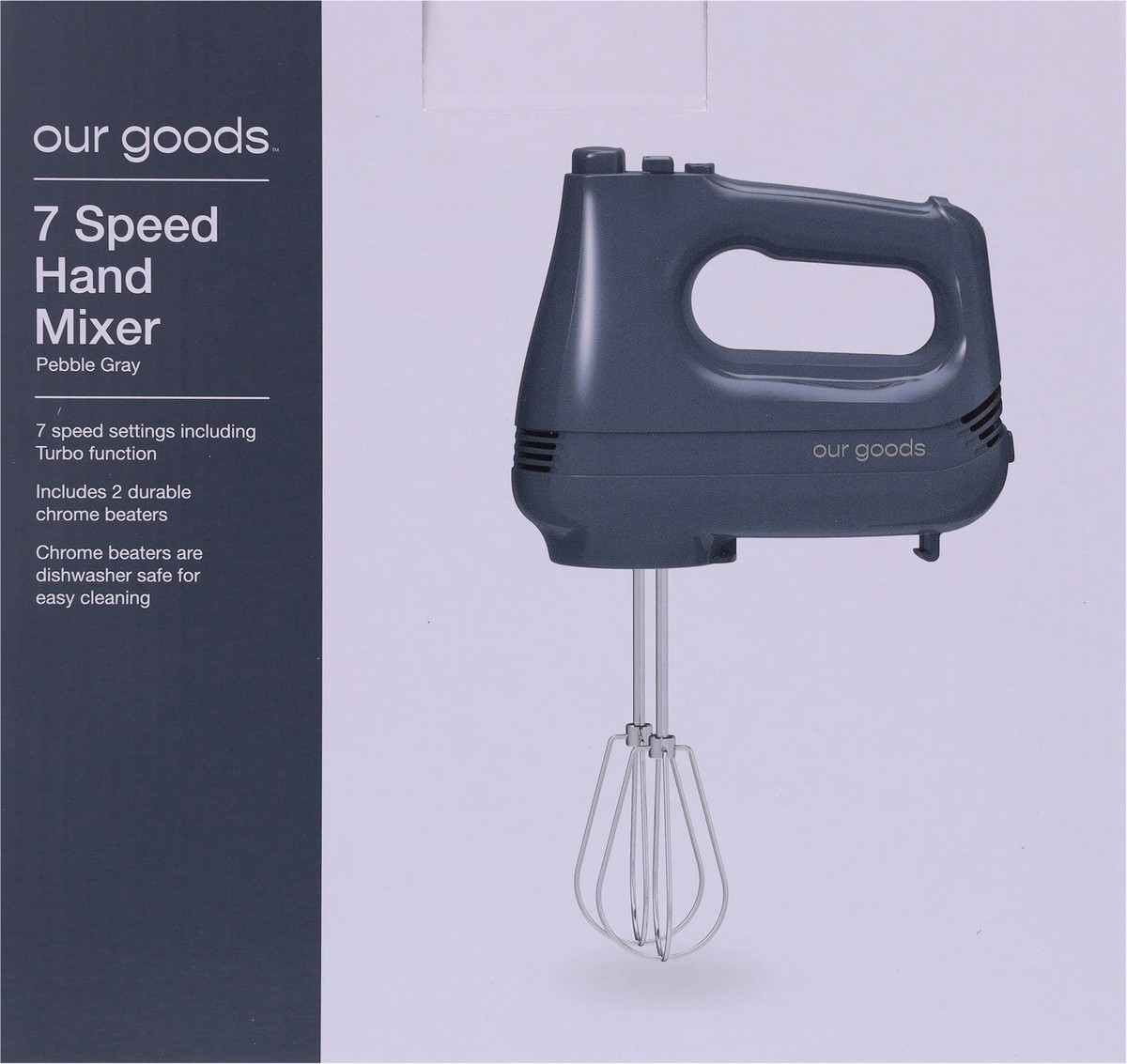 • 7 Speed setting including Turbo function • Includes 2 durable chrome beaters • Chrome beaters are dishwasher safe for easy cleaning • Color: Pebble Gray