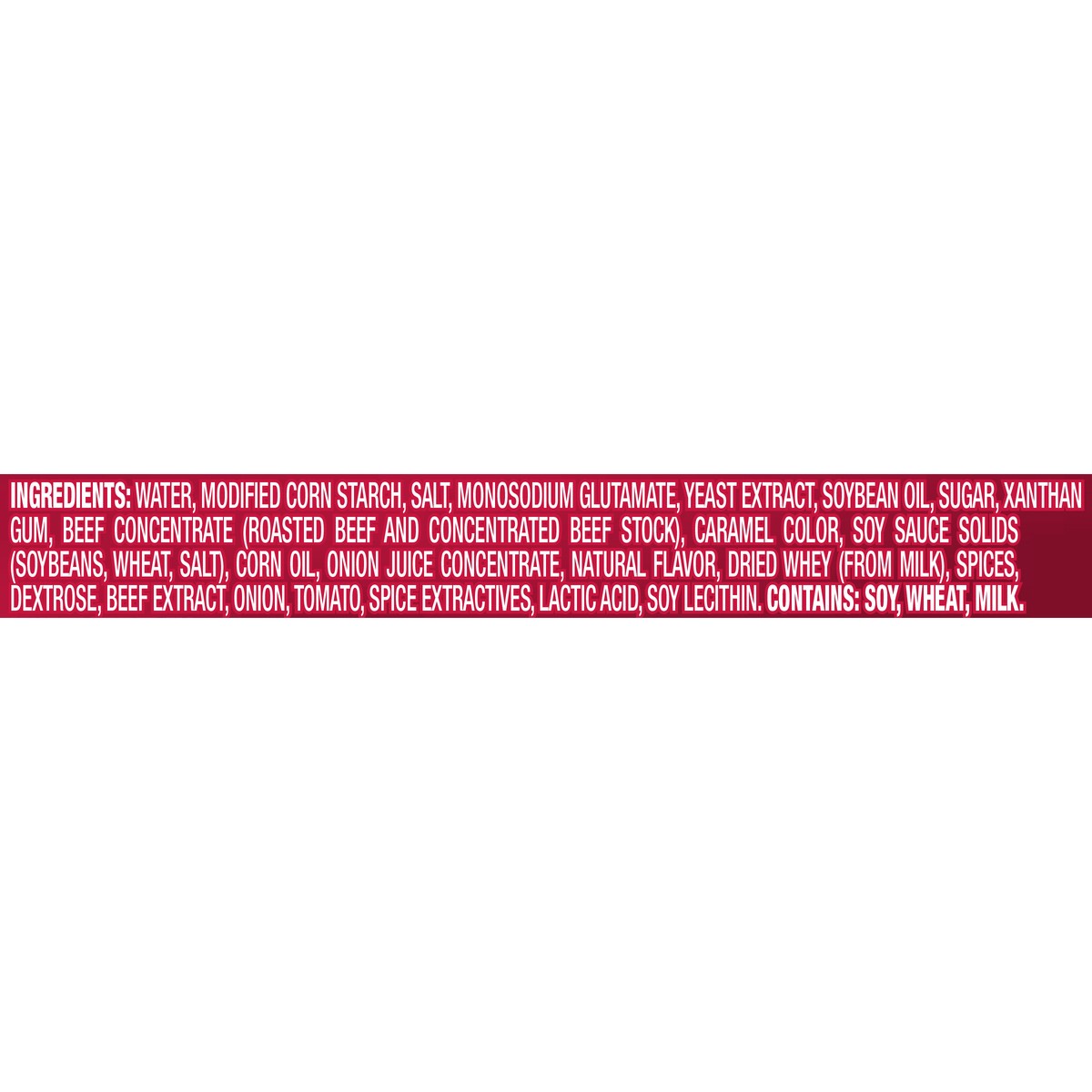 WATER, BEEF BROTH, MODIFIED FOOD STARCH, CONTAINS LESS THAN 2% OF SALT, YEAST EXTRACT, SOYBEAN OIL, SUGAR, BEEF, XANTHAN GUM, CARAMEL COLOR, NATURAL FLAVOR (CONTAINS CELERY, MILK), SUNFLOWER OIL, SOY …