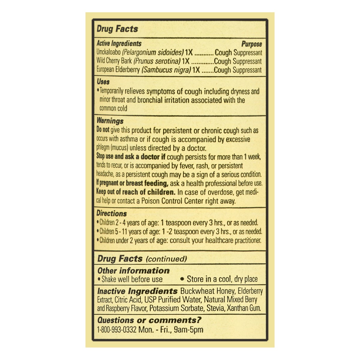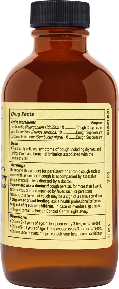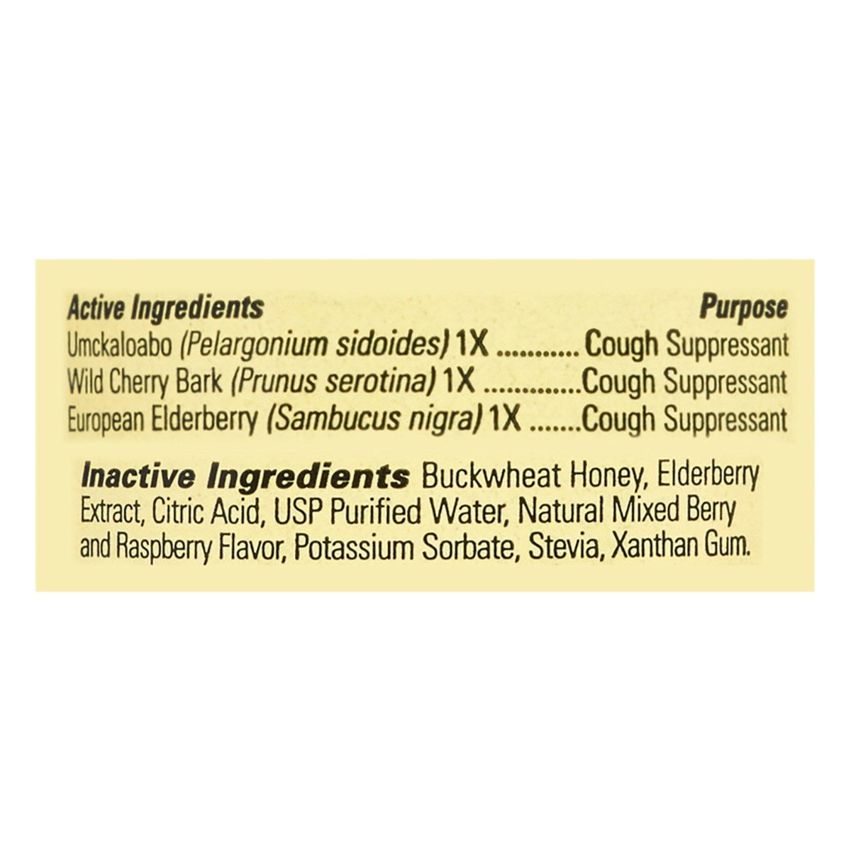 Active Ingredients: Umckaloabo (Pelargonium Sidoides) 1X, Cough Suppressant; Wild Cherry Bark (Prunus Serotina) 1X, Cough Suppressant; European Elderberry (Sambucus Nigra) 1X, Cough Suppressant. Inact…
