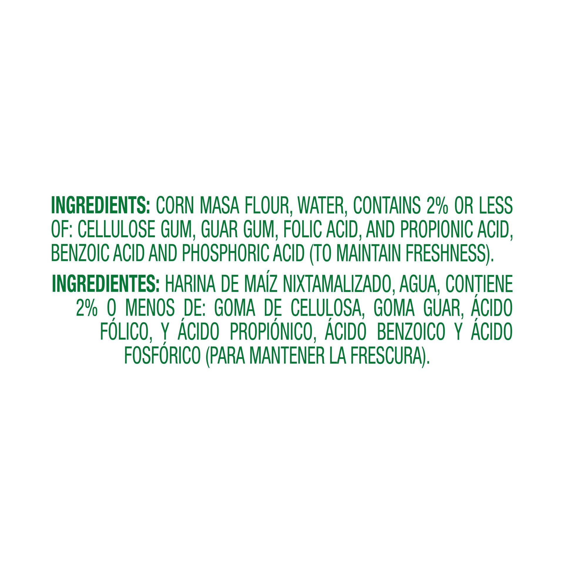 Ground Corn Treated with Lime, Water, Cellulose Gum, Propionic Acid (to Preserve Freshness), Benzoic Acid (to Preserve Freshness), Phosphoric Acid (Preservative), Dextrose, Guar Gum, Amylase.