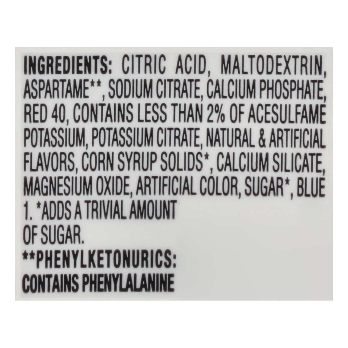 Citric Acid, Maltodextrin, Aspartame (Phenylketonurics: Contains Phenylalanine), Sodium Citrate, Calcium Phosphate, Red 40, Contains Less than 2% of Acesulfame Potassium, Potassium Citrate, Natural & …