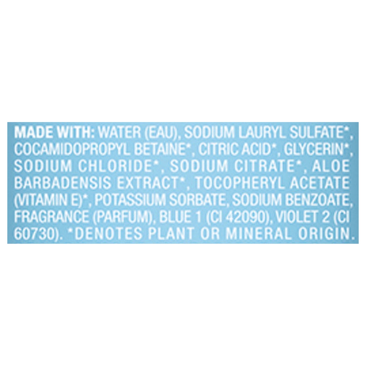 Made with: Water (Eau), Sodium Lauryl Sulfate*, Cocamidopropyl Betaine*, Citric Acid*, Glycerin*, Sodium Chloride*, Sodium Citrate*, Aloe Barbadensis Extract*, Tocopheryl Acetate (Vitamin E)*, Potassi…