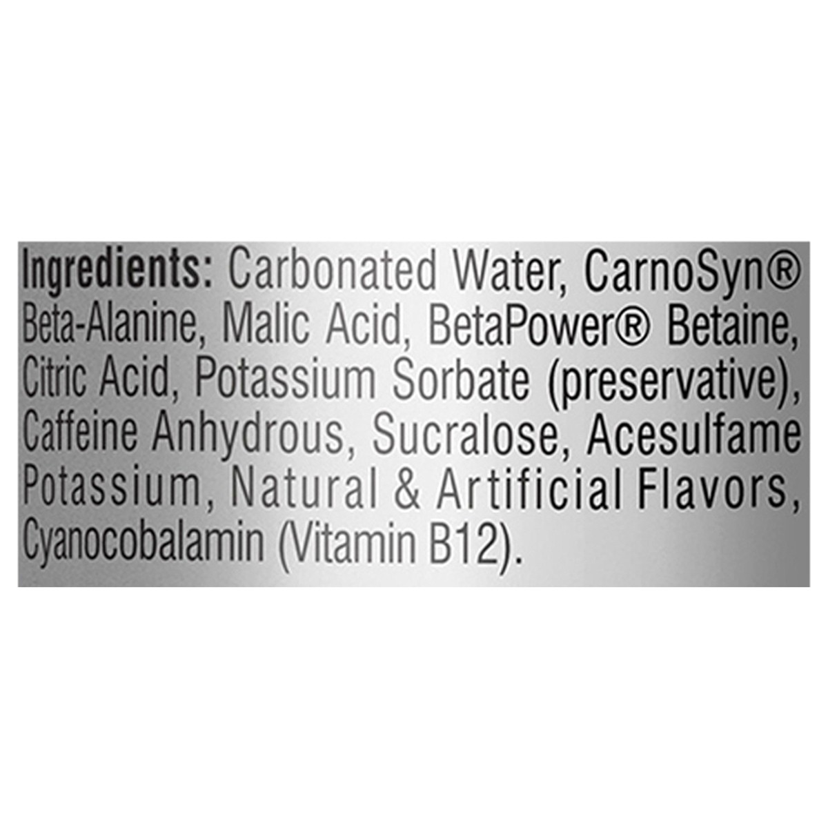 Carbonated Water, Carnosyn Beta-Alanine, Malic Acid, Beta Power Betaine, Citric Acid, Potassium Sorbate (Preservative), Caffeine Anhydrous, Sucralose, Acesulfame Potassium, Natural & Artificial Flavor…