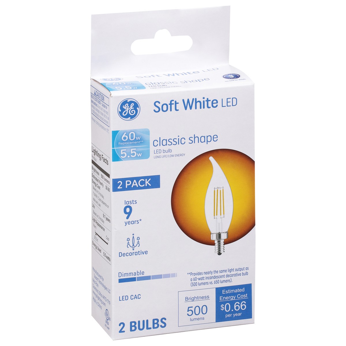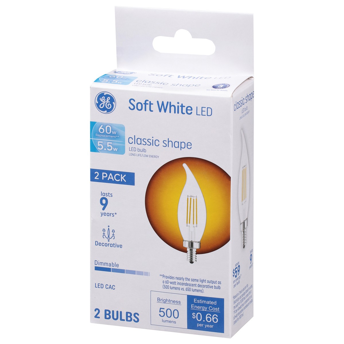 Brightness Quantity: 500 lumens. Energy Info: $0.66 based on 3 hrs/day, 11 cents/kWh. Cost depends on rates and use. 5.5 watts. Package Info: 2-Pack. 2. Bulb Info: Indoor. LED. Is Dimmable. Bulb Life:…