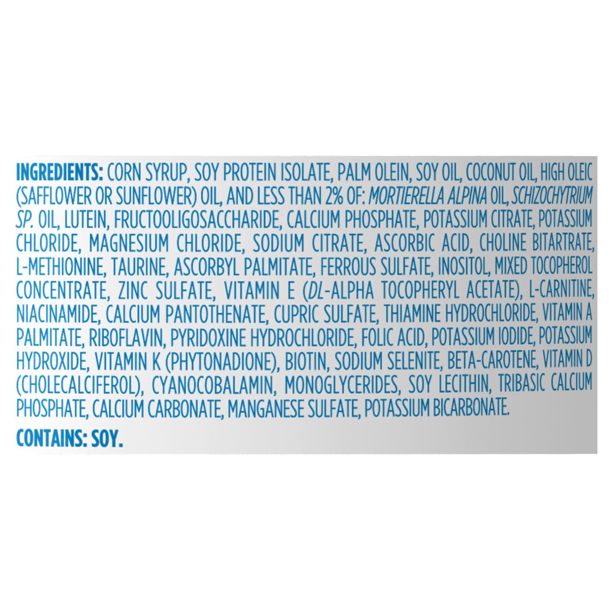 Corn Syrup, Soy Protein Isolate, Palm Olein, Soy Oil, Coconut Oil, High Oleic (Safflower or Sunflower) Oil, and Less than 2% of: Mortierella Alpina Oil, Schizochytrium Sp, Oil, Lutein, Fructooligosacc…