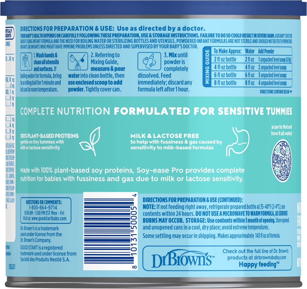 Dr. Brown's Good Start| Dr. Brown's Soy-ease Pro Baby Formula Powder, for Sensitive Tummies, Dairy Free and Lactose Free for Fussiness and Gas, Non-GMO