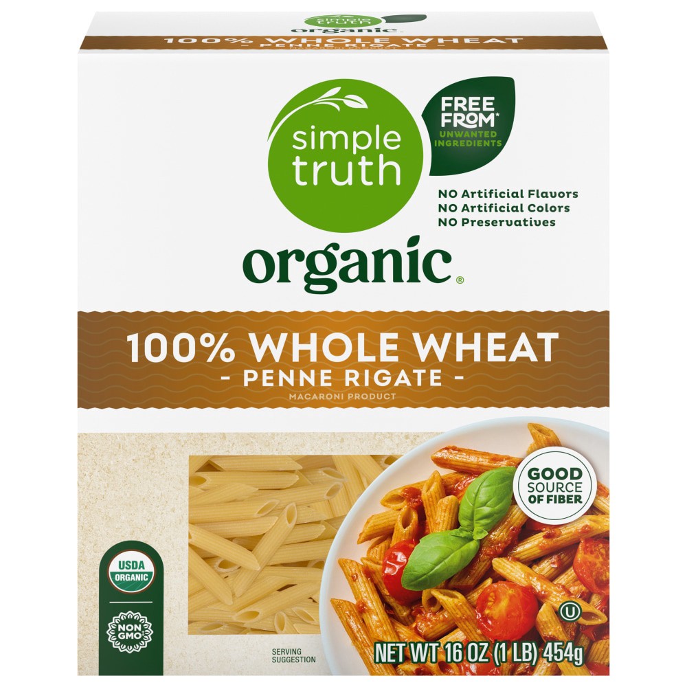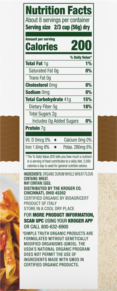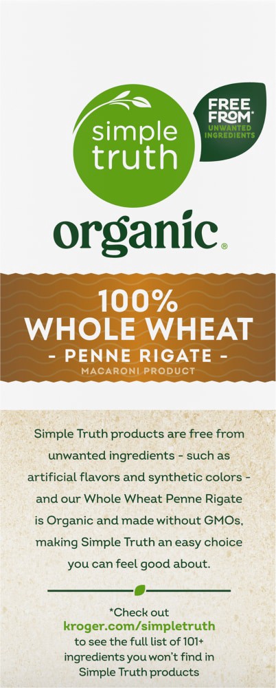 Organic macaroni product. USDA Organic. Certified organic by Bioagricert. 100% Whole Grain: 53 g or more per serving. 100% of the grain is whole grain. WholeGrainsCouncil.org. Good source of fiber. No…