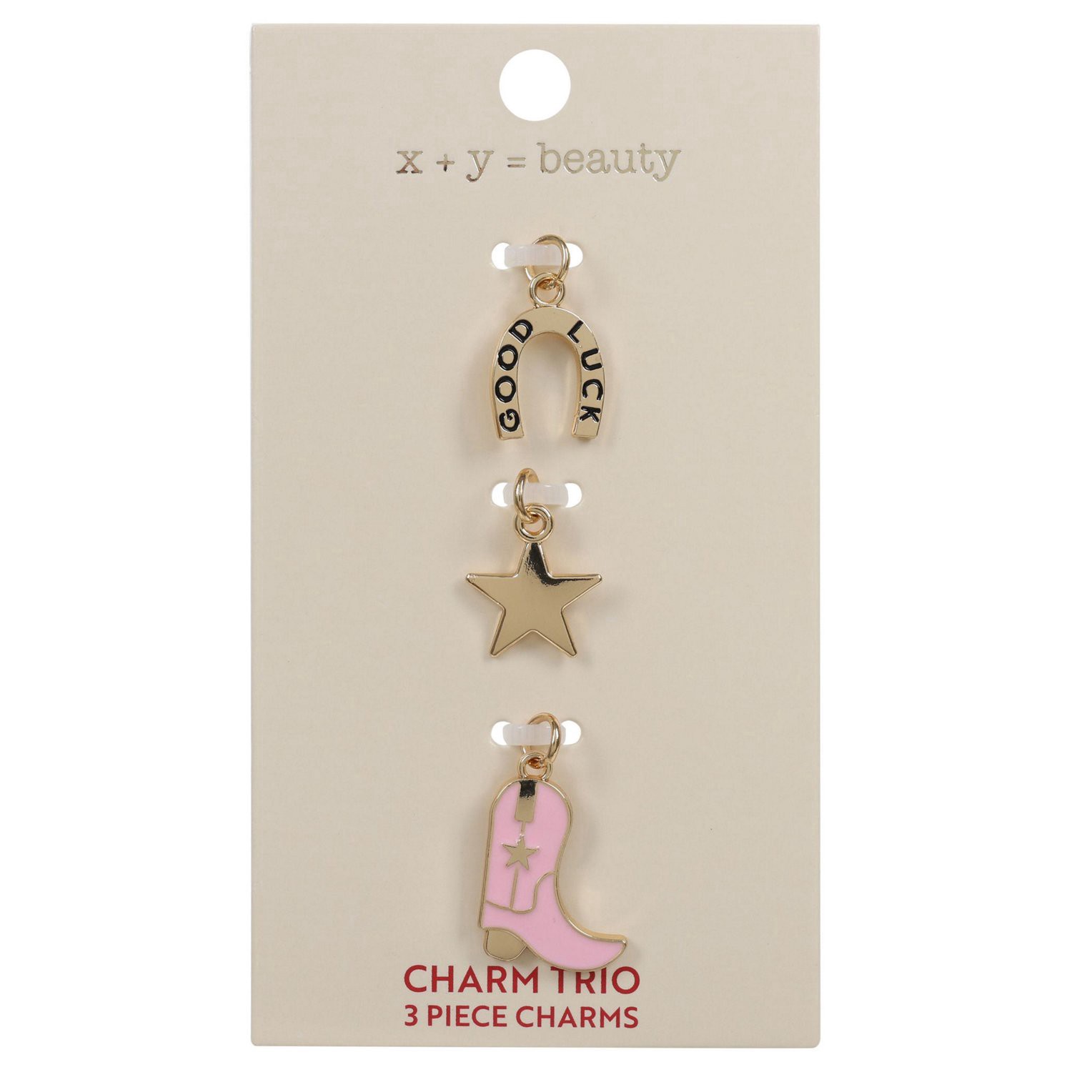 3-Pack Charm Trio, Playful charms to match your personality and to personalize your favorite lip product Good Luck Horseshoe, Star and Boot Zinc alloy + Paint 3 Charms on a backercard Each charm has a…