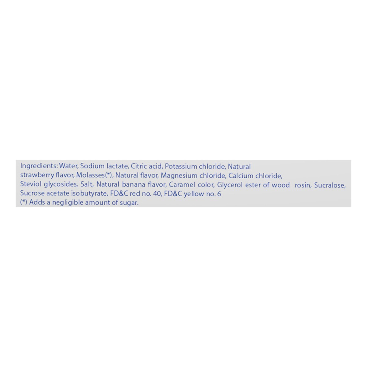 Water, Sodium Lactate, Citric Acid, Potassium Chloride, Natural Strawberry Flavor, Molasses(*), Natural Flavor, Magnesium Chloride, Calcium Chloride, Steviol Glycosides, Salt, Natural Banana Flavor, C…