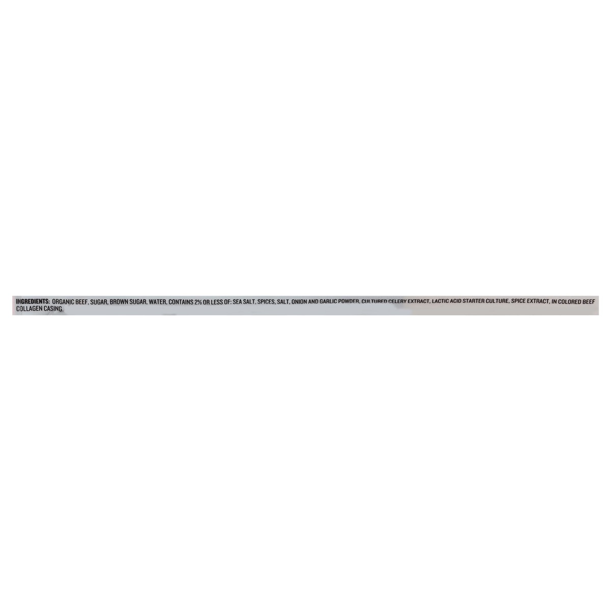 Organic Beef, Sugar, Brown Sugar, Water, Contains 2% or Less of: Sea Salt, Spices, Salt, Onion and Garlic Powder, Cultured Celery Extract, Lactic Acid Starter Culture, Spice Extract, in Colored Beef C…