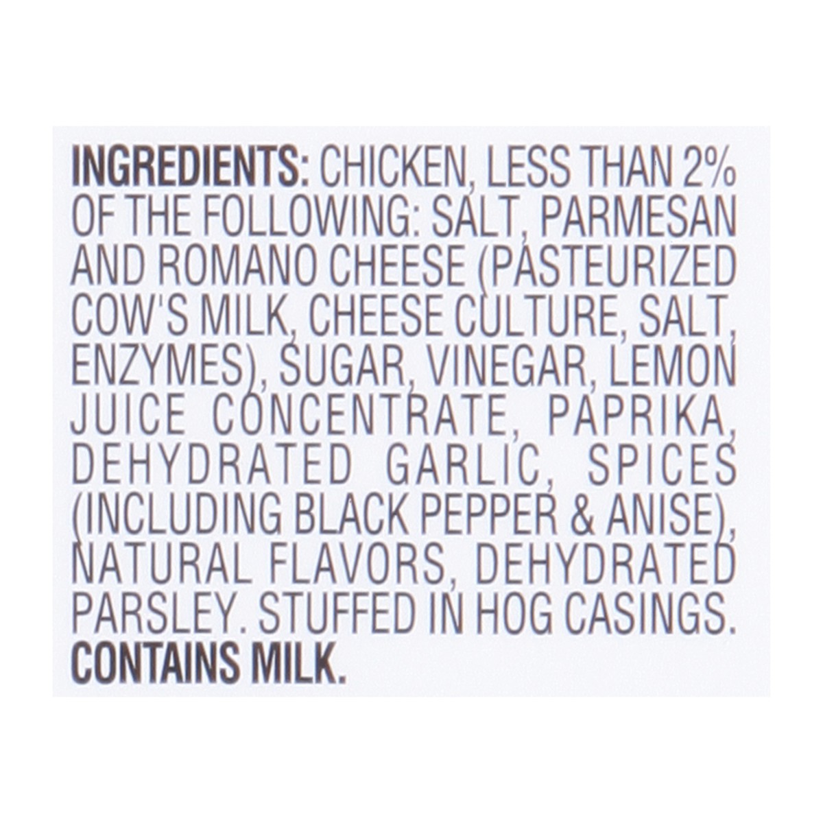 Chicken, Less than 2% of the Following: Salt, Parmesan and Romano Cheese (Pasteurized Cow’s Milk, Cheese Culture, Salt, Enzymes), Sugar, Vinegar, Lemon Juice Concentrate, Paprika, Dehydrated Garlic, S…