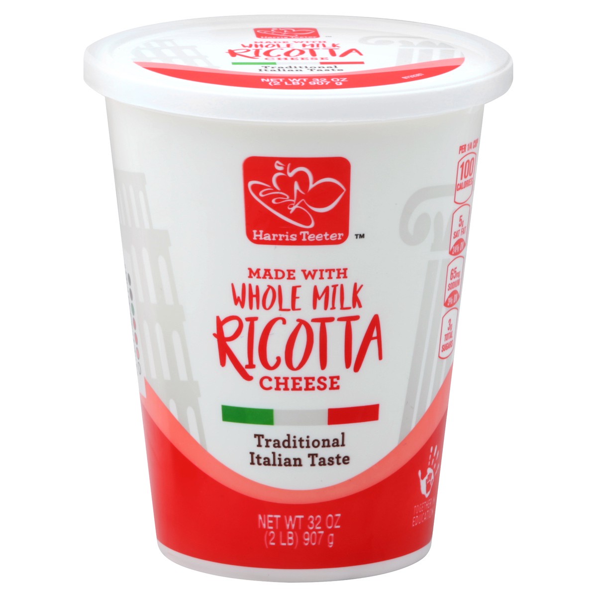 Traditional Italian taste. Made with whole milk. Per 1/4 Cup: 100 calories; 5 g sat fat (24% DV); 65 mg sodium (3% DV); 3 g total sugars. Ready to eat. Yourplusguarantee. 1-800-432-6111 or harristeete…