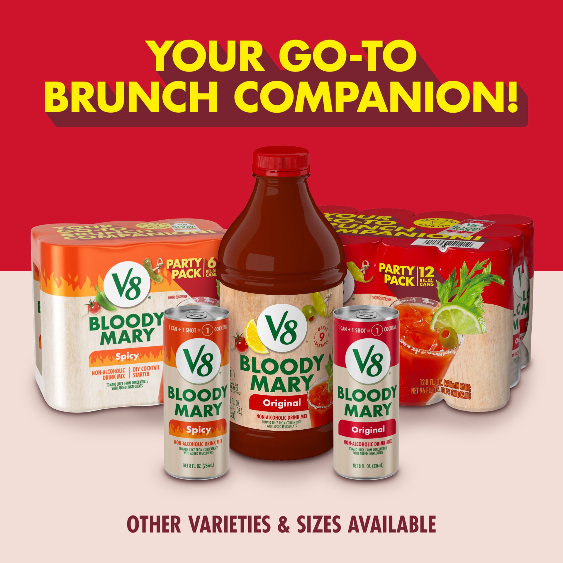 Make happy hour a little easier with V8 Bloody Mary Mix. Made with tomato juice and a perfect blend of spices, this non-alcoholic cocktail mix packs a punch to make every sip as delicious as the next.…