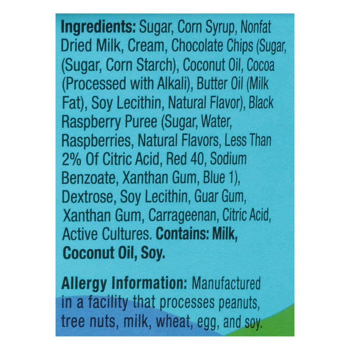 Sugar, Corn Syrup, Nonfat Dried Milk, Cream, Chocolate Chips (Sugar, (Sugar, Corn Starch), Coconut Oil, Cocoa (Processed with Alkali), Butter Oil (Milk Fat), Soy Lecithin, Natural Flavor), Black Raspb…