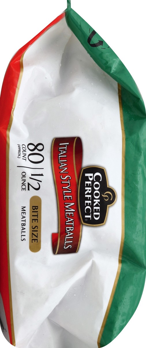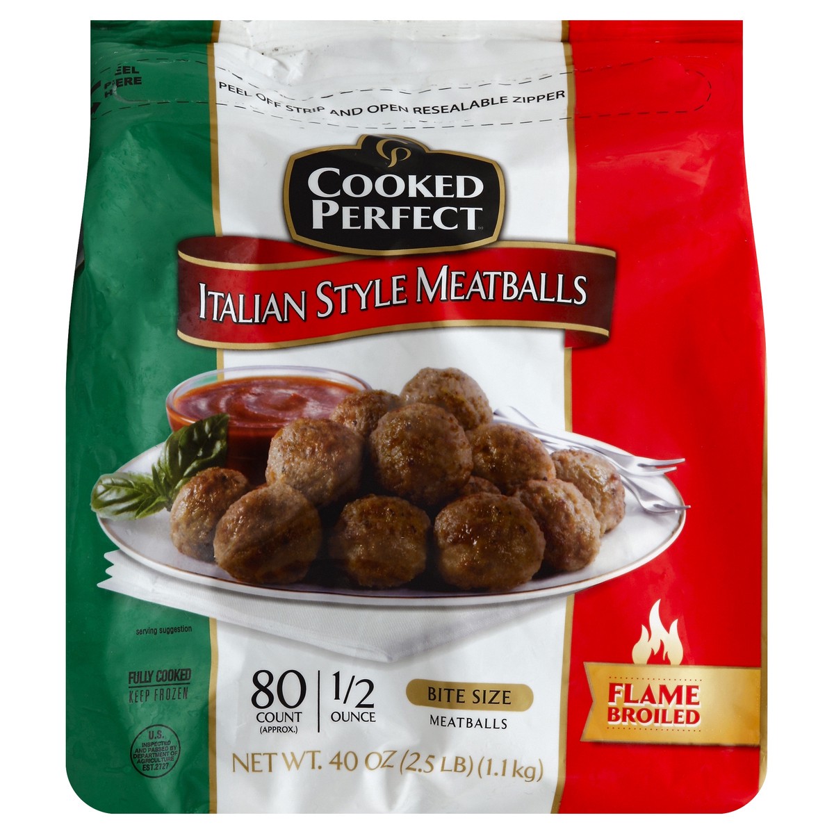 1/2 ounce. Flame broiled. US inspected and passed by Department of Agriculture. Thank you for purchasing Cooked Perfect Italian Style Meatballs. We use only the finest ingredients, seasoned with a cus…