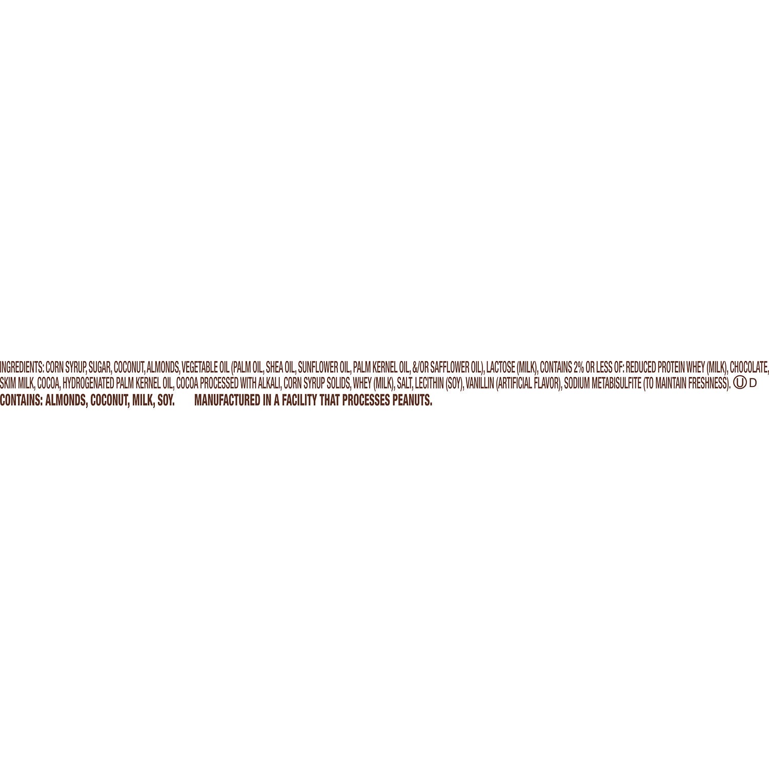 Corn Syrup, Sugar, Coconut, Almonds, Vegetable Oil (Palm Oil, Shea Oil, Sunflower Oil, Palm Kernel Oil, and/or Safflower Oil), Chcolate, Skim Milk, Contains 2% or Less of: Lactose (Milk), Cocoa, Whey …