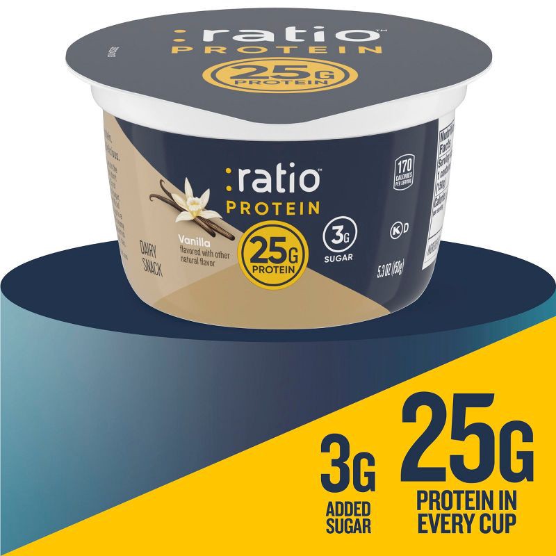 - CONTAINS: One 5.3 oz cup of Ratio Protein Vanilla Yogurt Cultured Dairy Snack