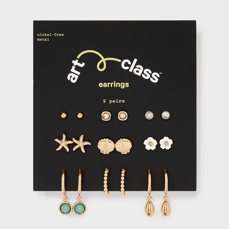 Add a splash of fun to any outfit with this 9-pack earring set featuring beach icons and hoops from Art Class. Crafted from a mix of acrylic, iron, steel and zinc alloy, these earrings offer a playful…