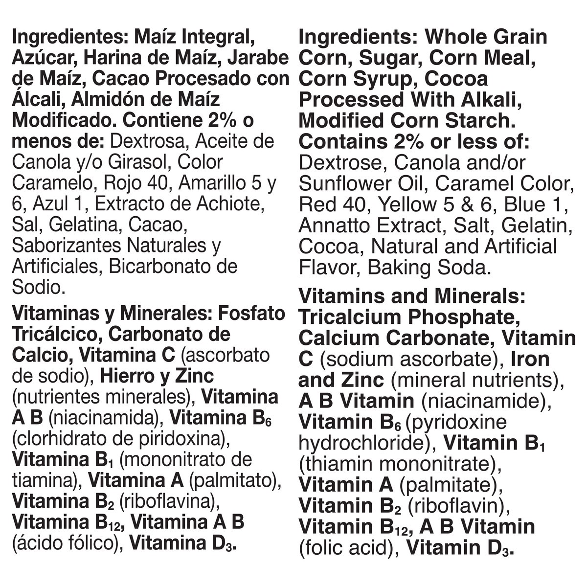 Whole Grain Corn, Sugar, Corn Meal, Corn Syrup, Cocoa Processed with Alkali, Modified Corn Starch. Contains 2% or Less of: Dextrose, Canola and/or Sunflower Oil, Caramel Color, Red 40, Yellow 5 & 6, B…