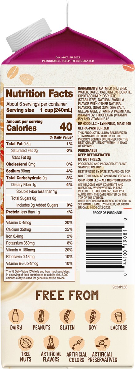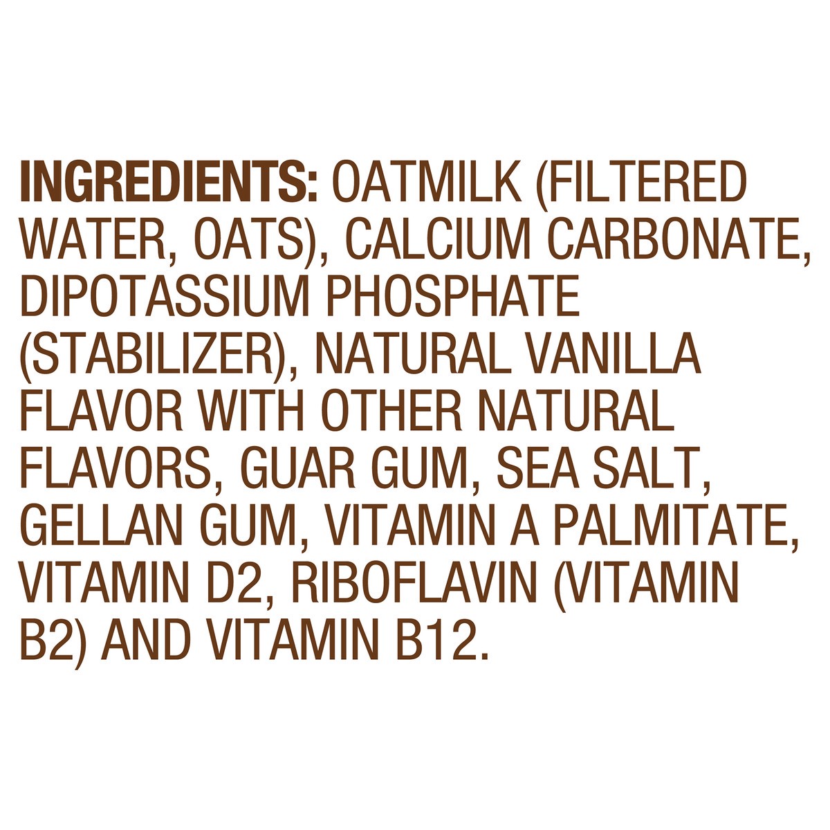 Oatmilk (Filtered Water, Oats), Calcium Carbonate, Dipotassium Phosphate (Stabilizer), Natural Vanilla Flavor with Other Natural Flavors, Guar Gum, Sea Salt, Gellan Gum, Vitamin A Palmitate, Vitamin D…