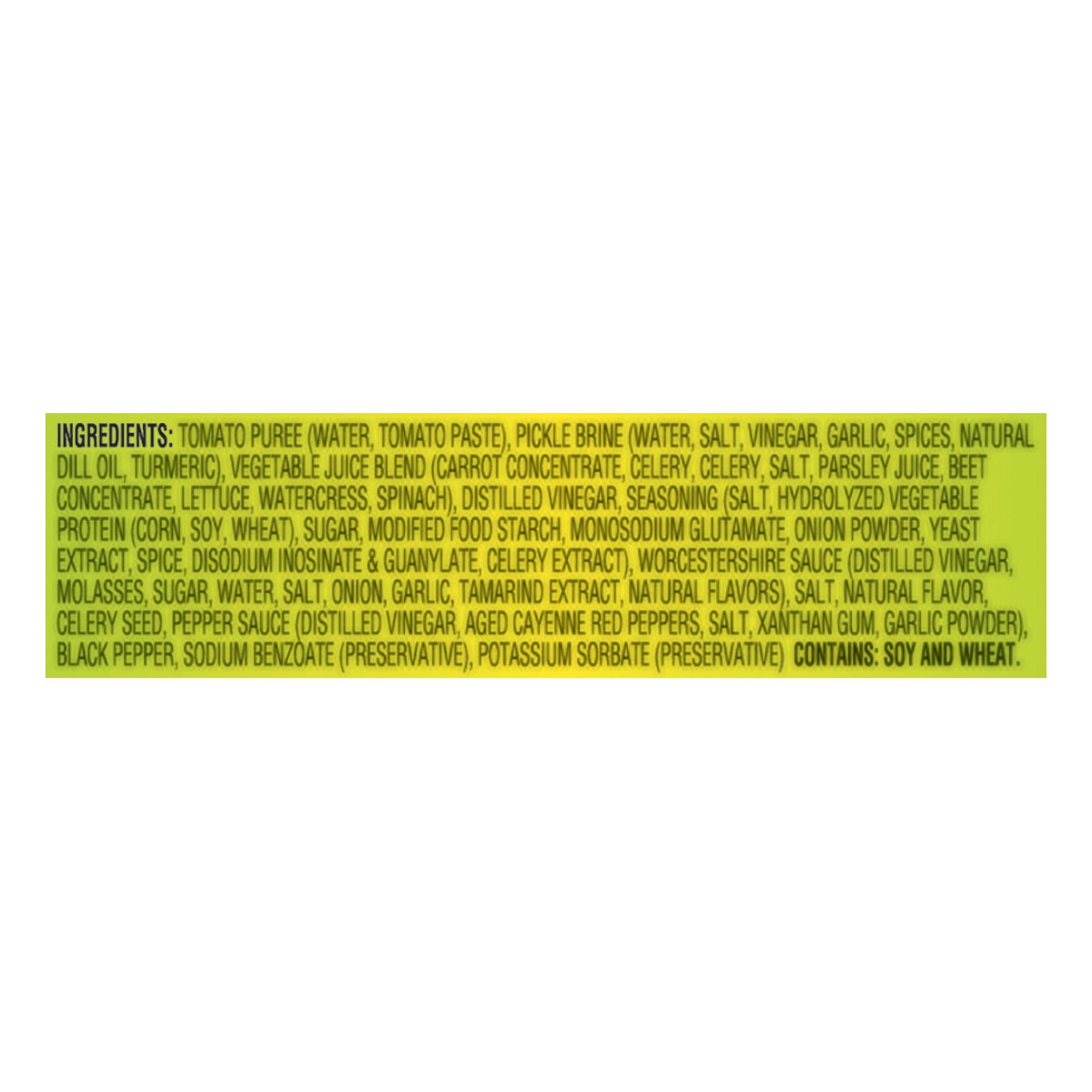 Tomato Puree (Water, Tomato Paste), Pickle Brine (Water, Salt, Vinegar, Garlic, Spices, Natural Dill Oil, Turmeric), Vegetable Juice Blend (Carrot Concentrate, Celery, Celery, Salt, Parsley Juice, Bee…