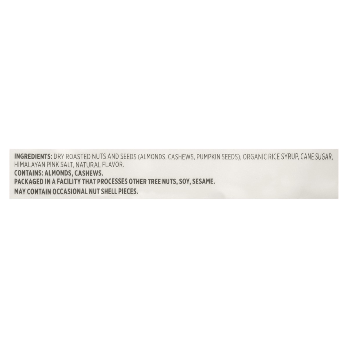Dry Roasted Nuts and Seeds (Almonds, Cashews, Pumpkin Seeds), Organic Rice Syrup, Cane Sugar, Himalayan Pink Salt, Natural Flavor.