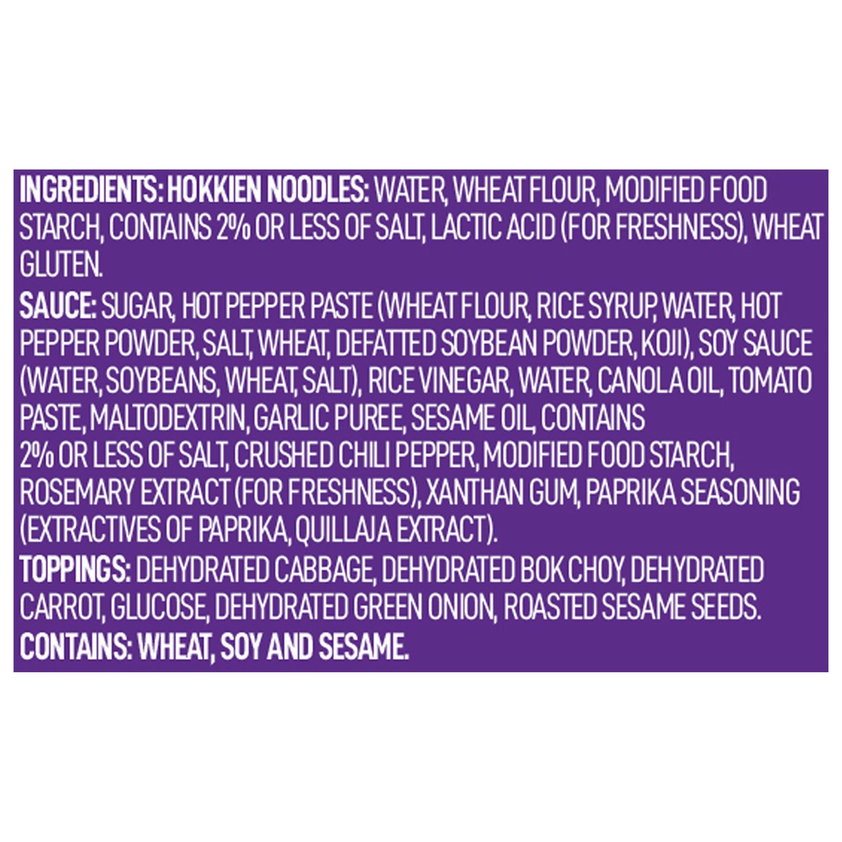 Hokkien Noodles: Water, Wheat Flour, Modified Food Starch, Contains 2% or Less of Salt, Lactic Acid (for Freshness), Wheat Gluten, Sauce: Sugar, Hot Pepper Paste (Wheat Flour, Rice Syrup, Water, Hot P…
