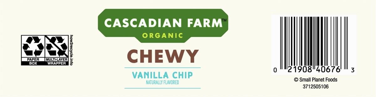 Cascadian Farm Organic Vanilla Chip Chewy Granola Bars are chewy granola bars of sweet vanilla chips paired with wholesome rolled oats for a tasty snack any time of day. Certified organic - granola ba…