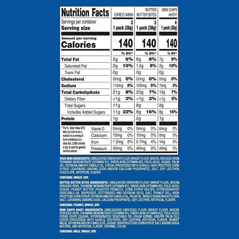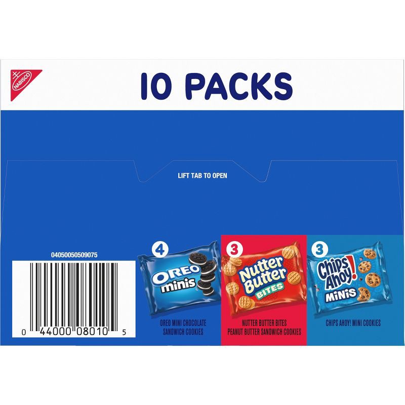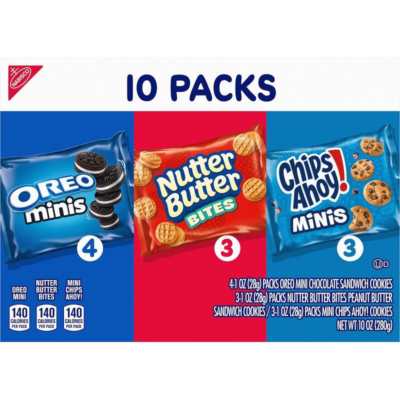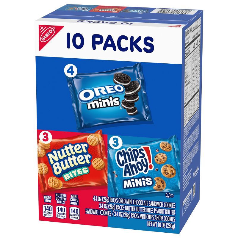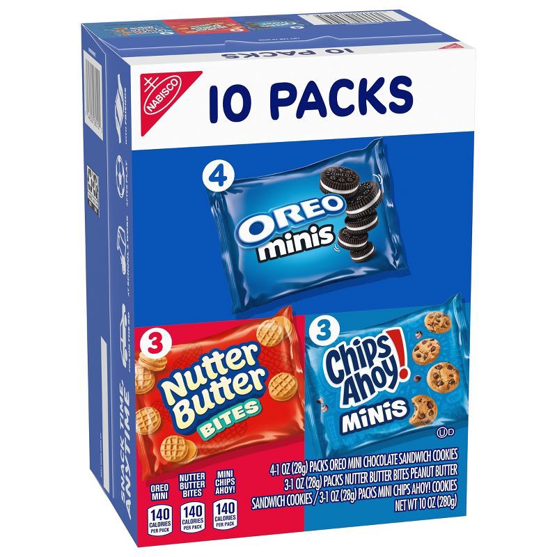 - One Nabisco Cookie Variety Pack with 10 - 1 oz snack packs, including 4 packs of OREO Mini, 3 packs of Nutter Butter Bites, and 3 packs of CHIPS AHOY! Mini (packaging may vary)