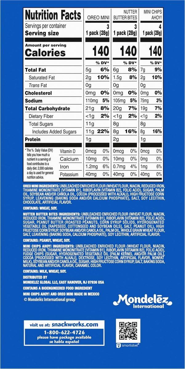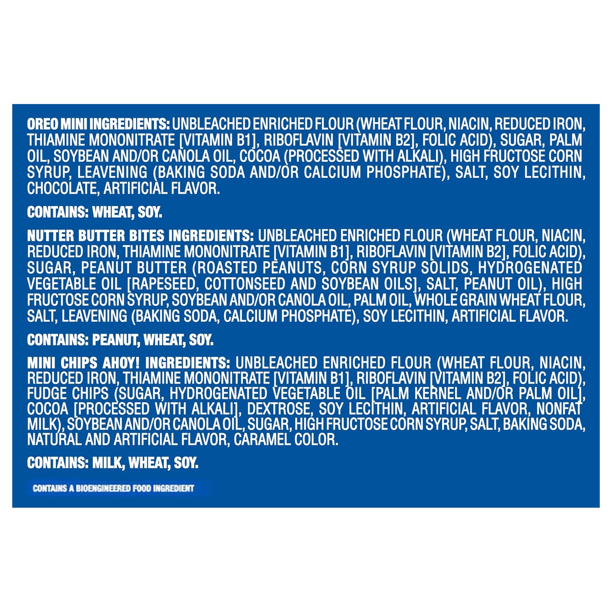 Oreo mini: contains: wheat, soy.,nutter butter bites: contains: peanut, wheat, soy.,mini chips ahoy!: contains: milk, wheat, soy.