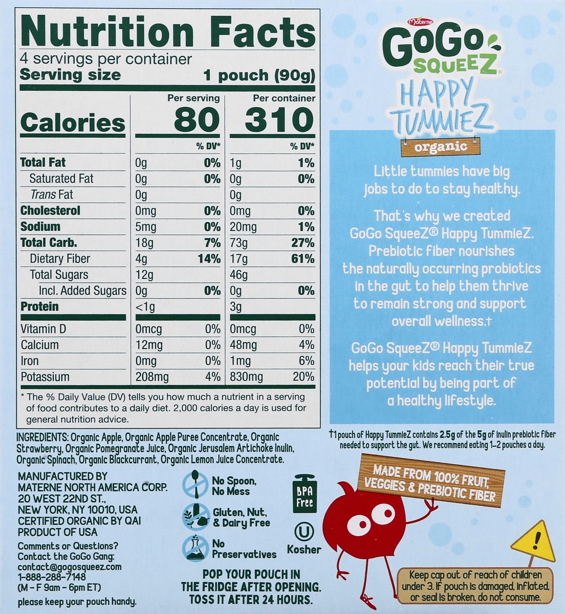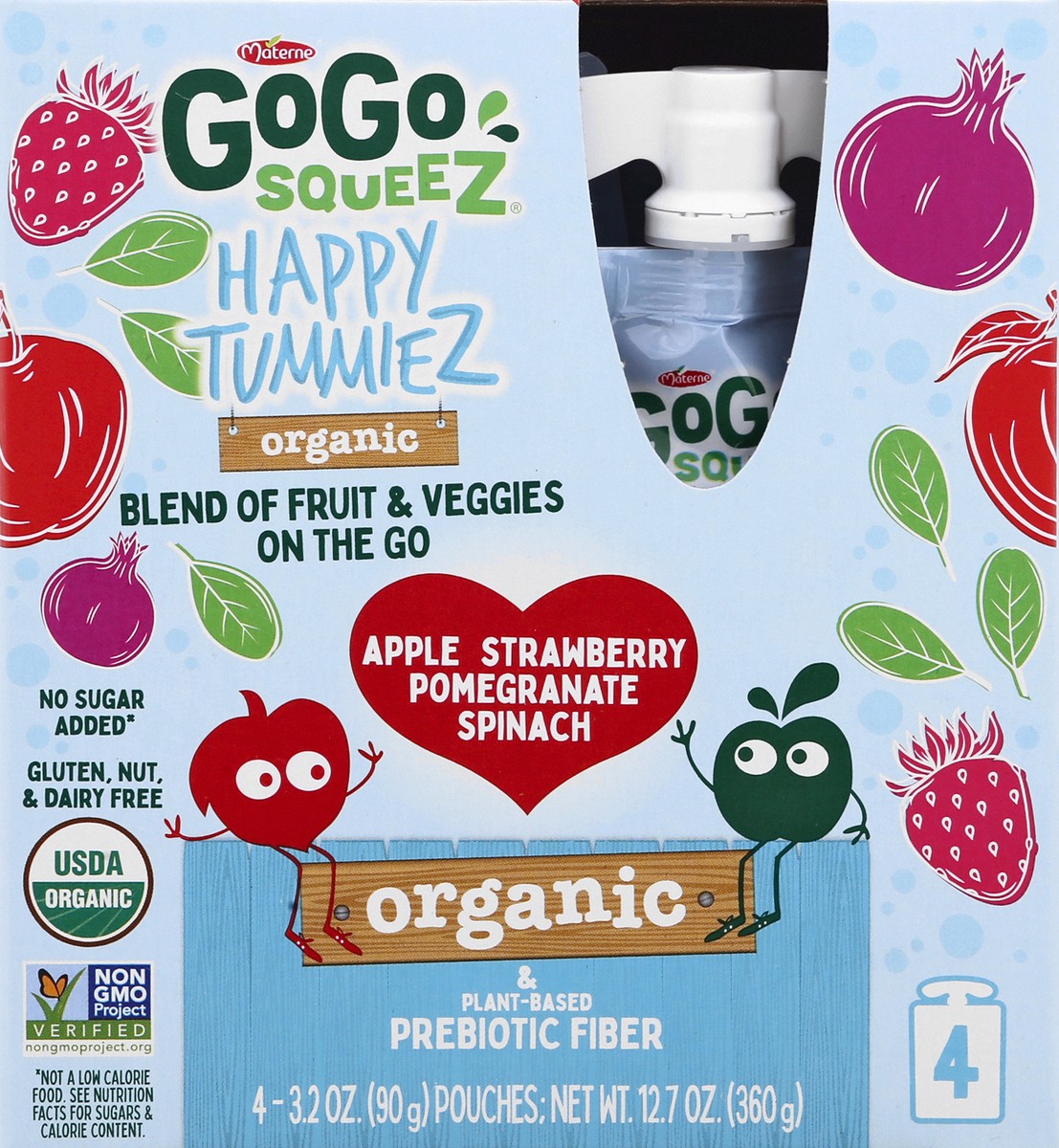 Blend of fruit & veggies on the go. USDA Organic. Certified Organic by QAI. Gluten, nut & dairy free. No sugar added! (Not a low calorie food. See nutrition facts for sugars & calorie content). No art…
