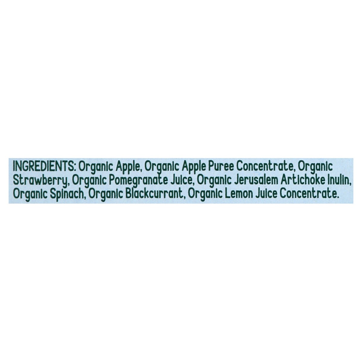 Organic Apple, Organic Apple Puree Concentrate, Organic Strawberry, Organic Pomegranate Juice, Organic Jerusalem Artichoke Inulin, Organic Spinach, Organic Blackcurrant, Organic Lemon Juice Concentrat…
